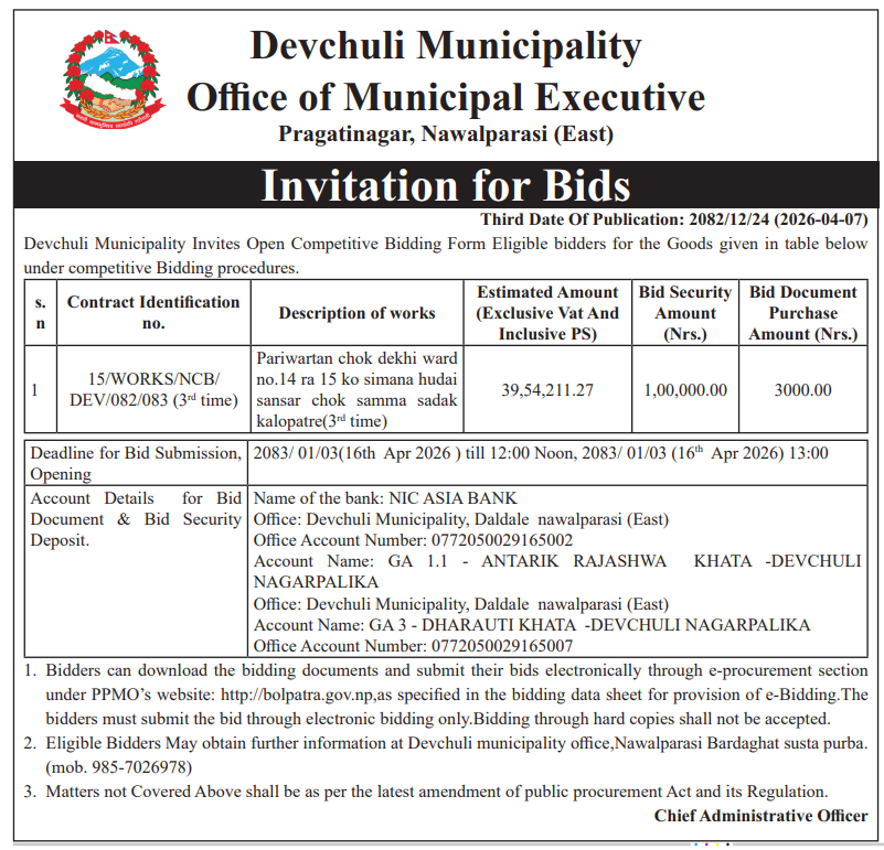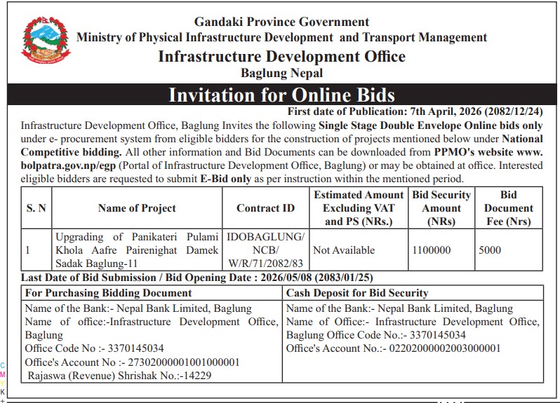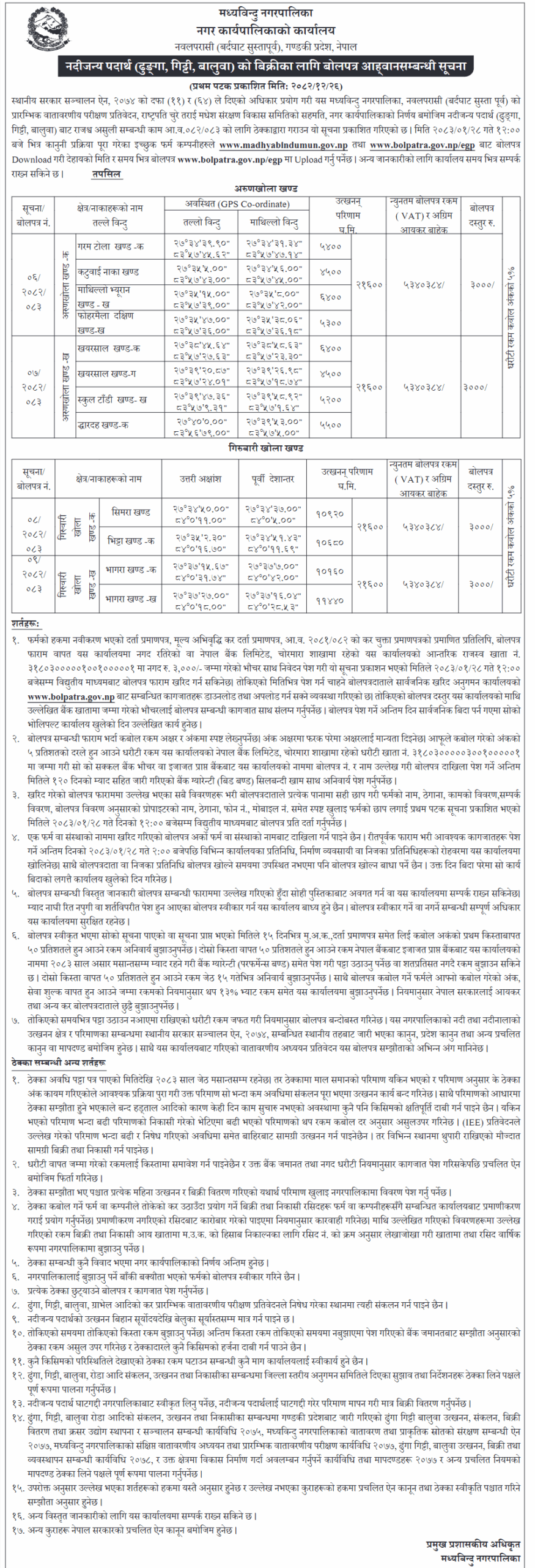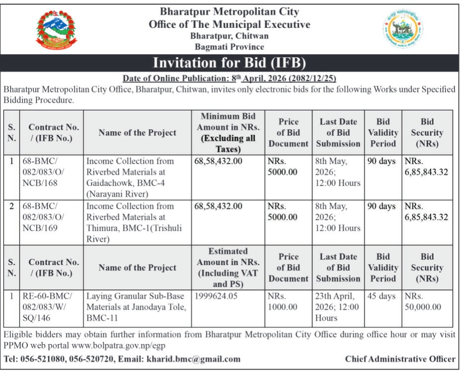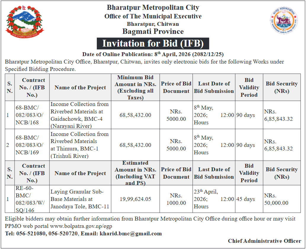 | 190 | Bharatpur Metropolitian City Office, Bagmati Province, CHITWAN; | Income Collection from Riverbed Materials at Gaidachowk, BMC-4 (Narayani River) | 08/04/2026 | PPMO | 08/05/2026 | Click Here | |