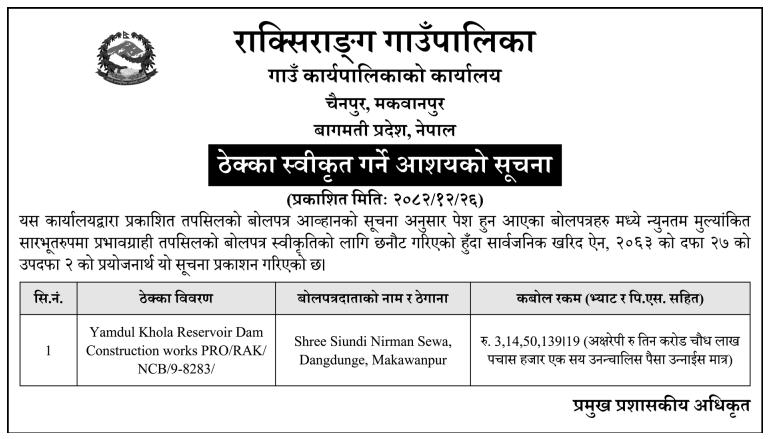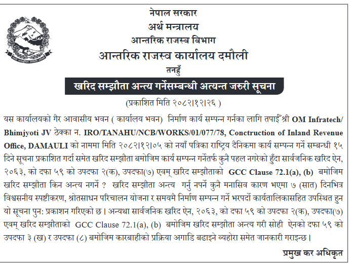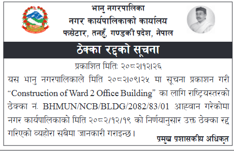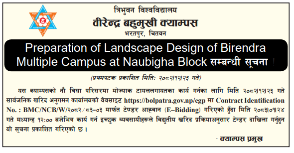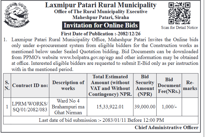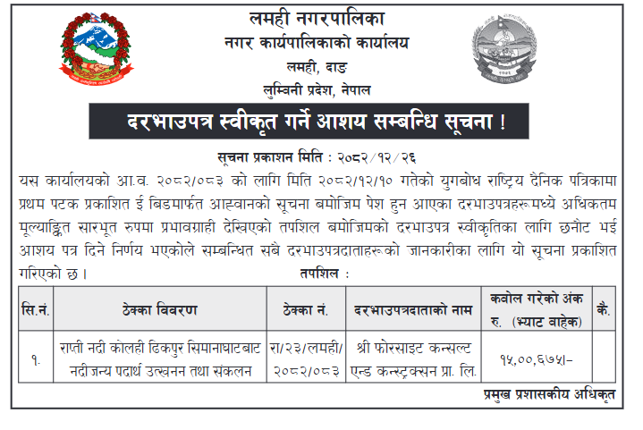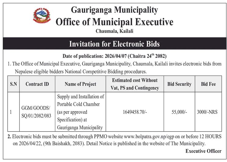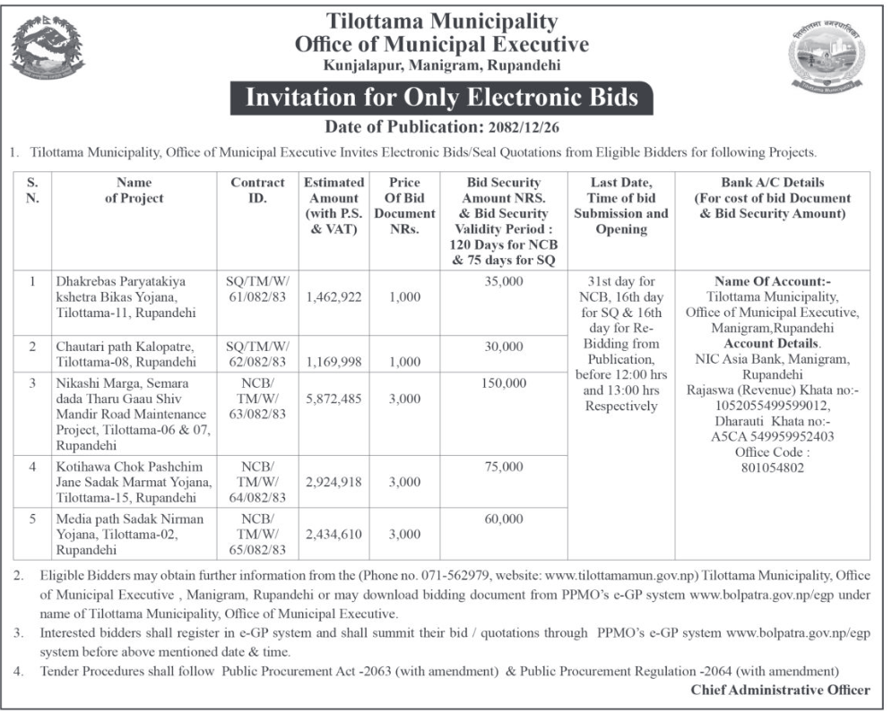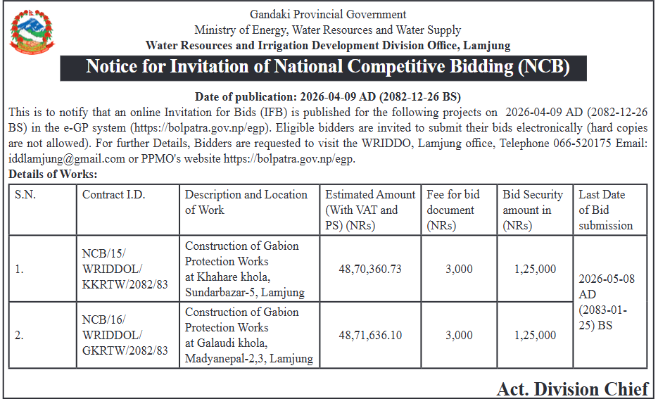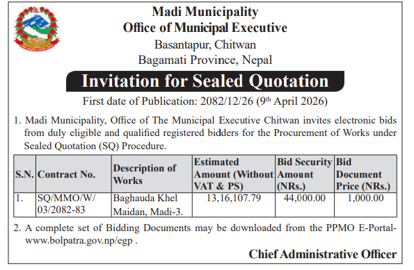 | 190 | Bharatpur Metropolitian City Office, Bagmati Province, CHITWAN; | Income Collection from Riverbed Materials at Gaidachowk, BMC-4 (Narayani River) | 08/04/2026 | PPMO | 08/05/2026 | Click Here | |