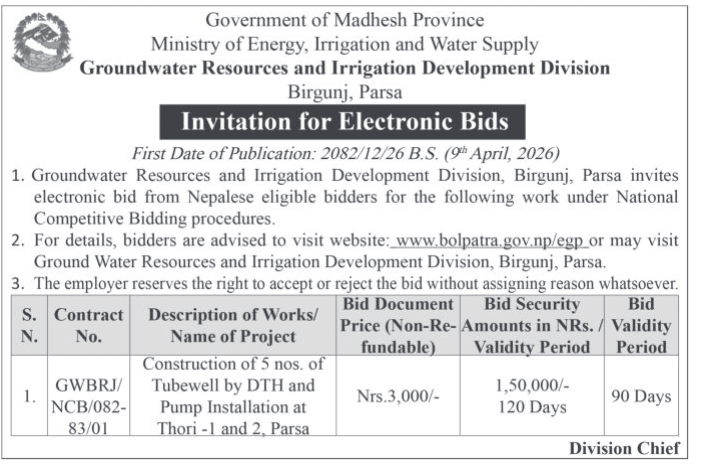 | 194 | Bideha Municipality,Dhanusha | Agriculture Electrification in Bideha Municipality,Tinkauriya Dhanusha | 08/04/2026 | PPMO | 08/05/2026 | Click Here | |