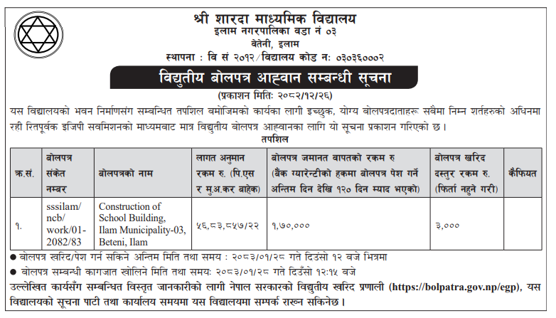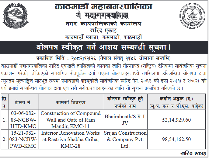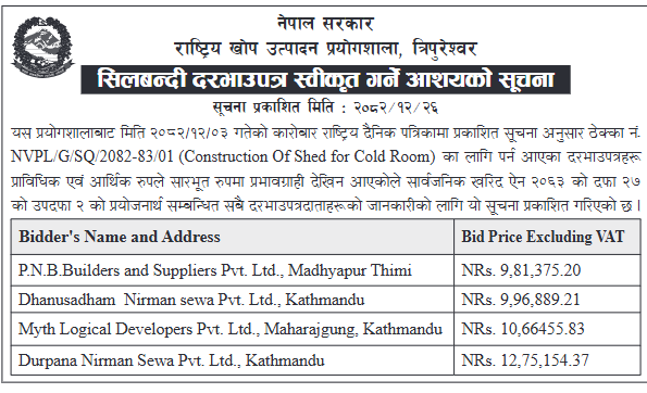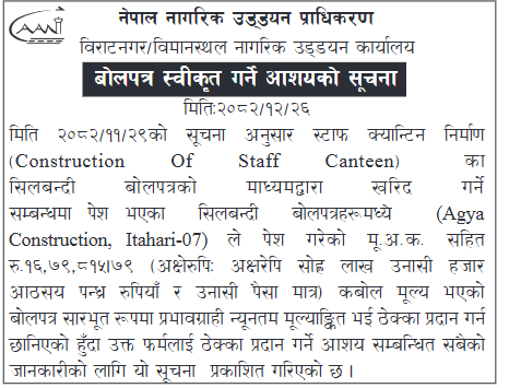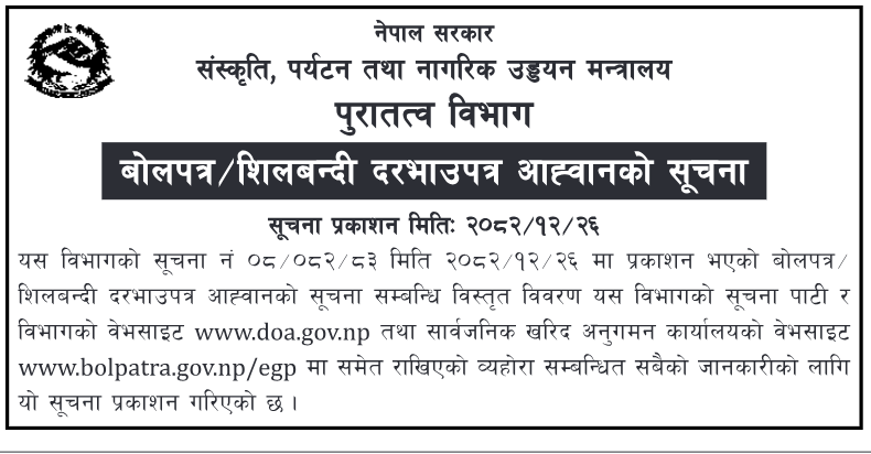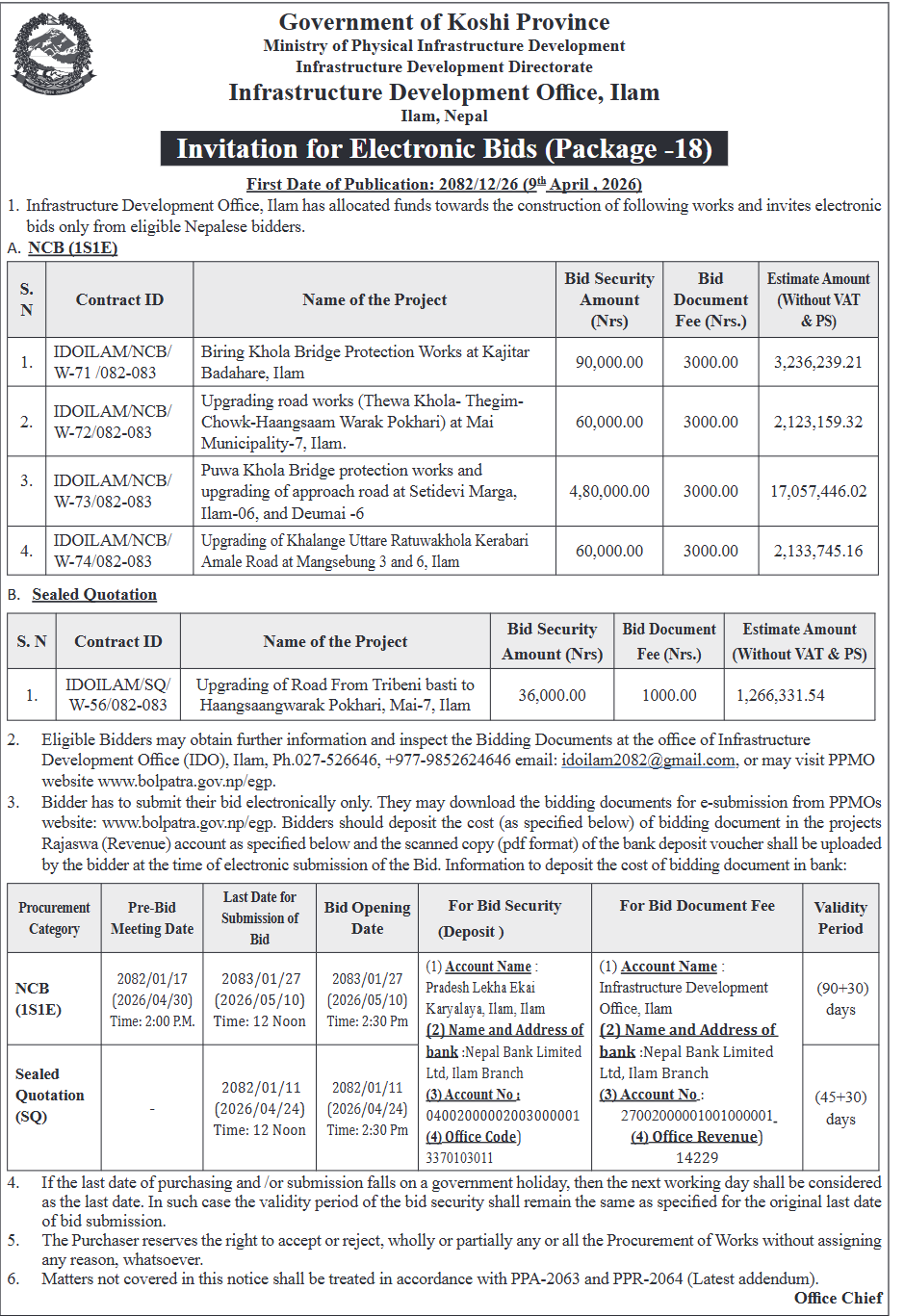 | 192 | Armed Police Force, Nepal No.9 Pashupatinath Brigade HQS | construction of Barrack and other civil works | 08/04/2026 | PPMO | 08/05/2026 | Click Here | |