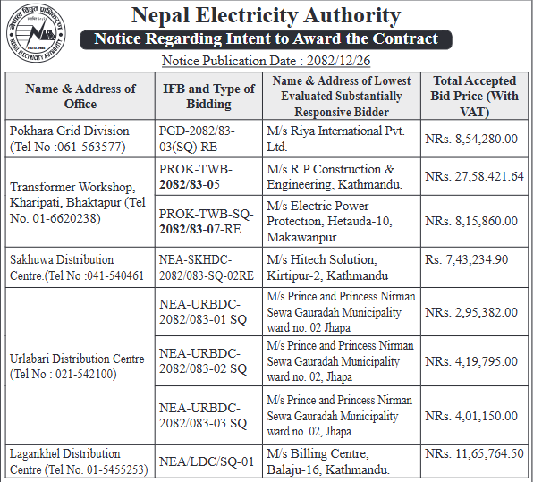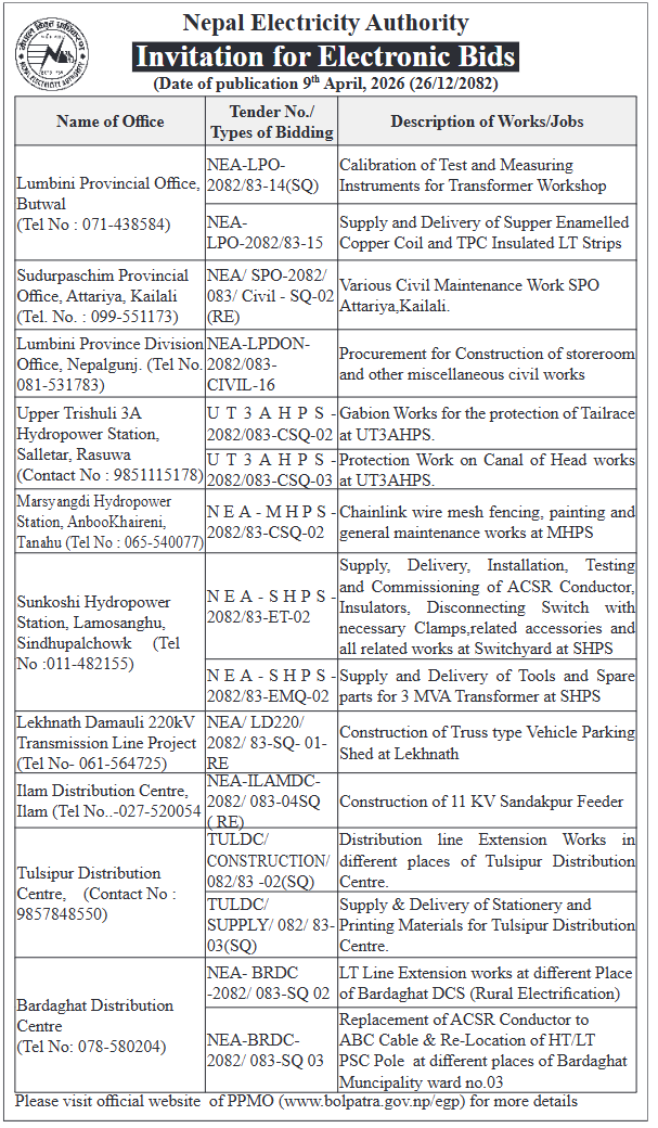 | 32 | NEA, Marsyangdi Hydropower Station | Supply and Delivery of Various Electrical Consumables at MHPS | 08/04/2026 | PPMO | 23/04/2026 | Click Here | |