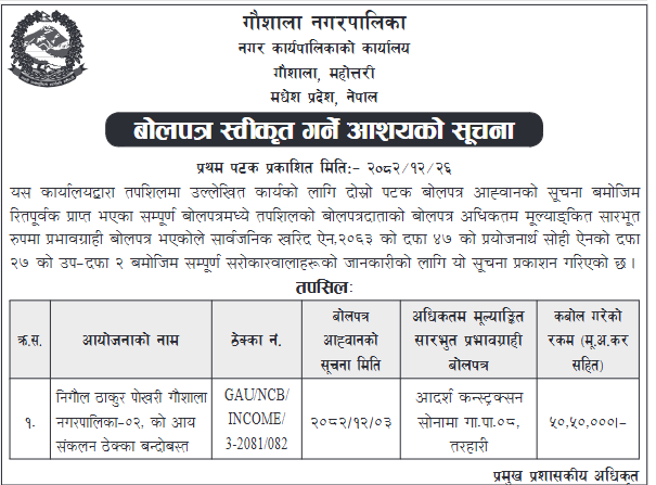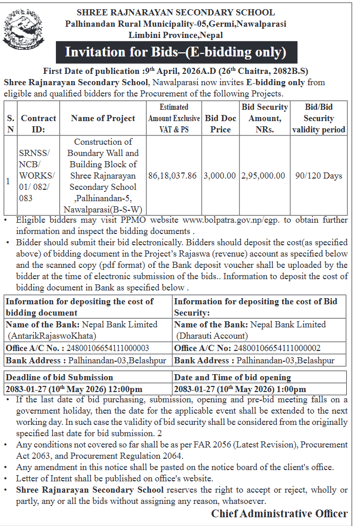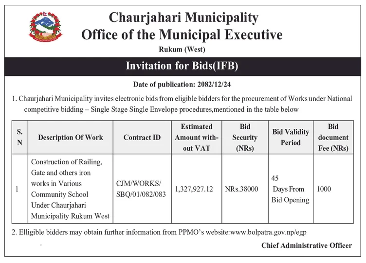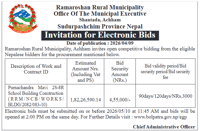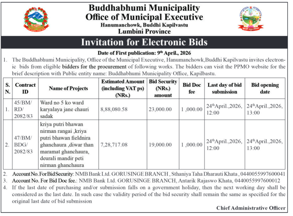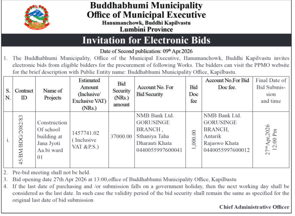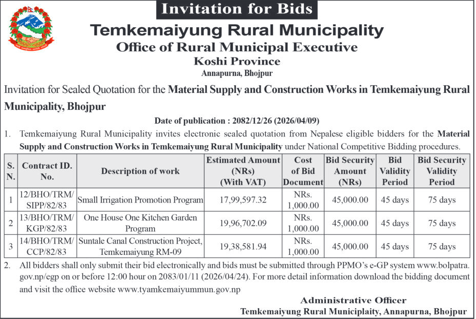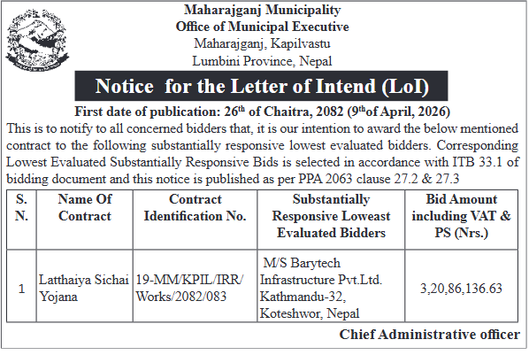 | 141 | Maharajganj Municipality | Maharajganj Nagarpalika ward no.1 Maharajganj Gaun ko Kalimandir Jirnodhar Puna Nirman | 08/04/2026 | PPMO | 22/04/2026 | Click Here | |