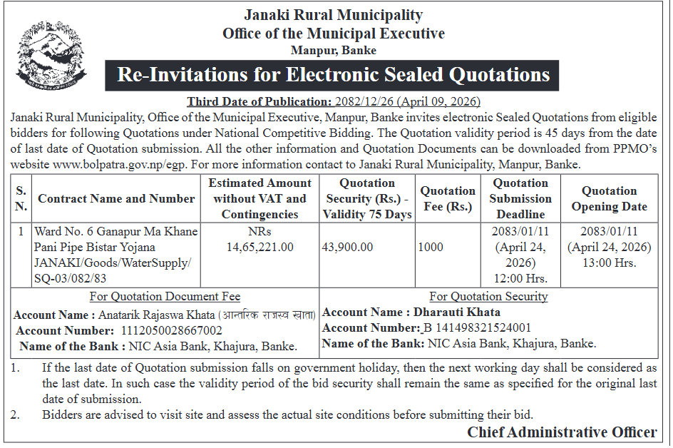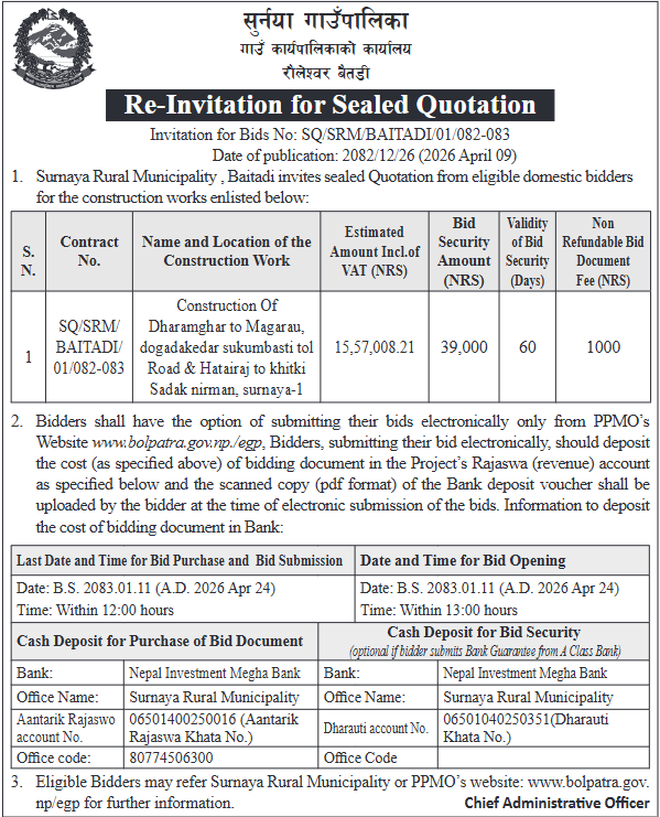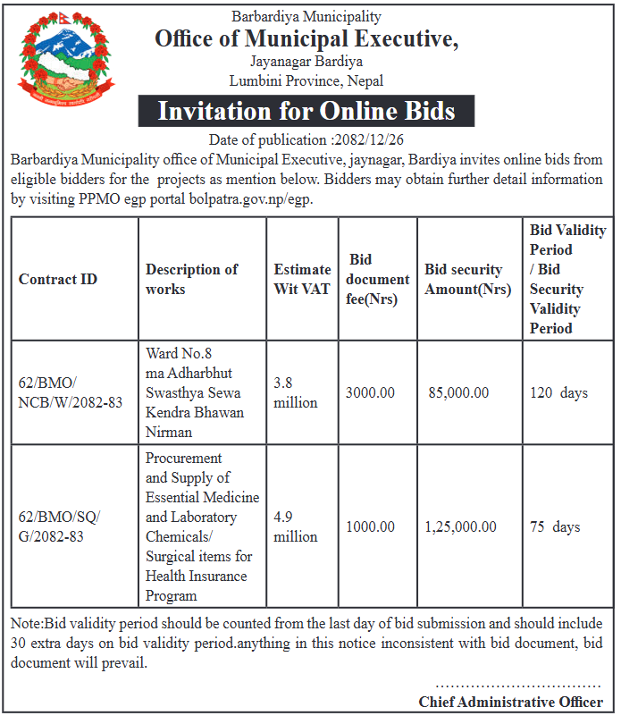 | 13 | Barbardiya Municipality | Procurement and Supply of Essential Medicine and Laboratory Chemicals/Surgical items for Health Insurance Program | 08/04/2026 | PPMO | 23/04/2026 | Click Here | |