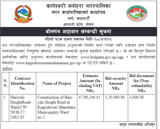 | 28 | Sahari Bikash Tatha bhawan Karyalaya Kavre | Rohini Bhanjyang Dekhi Nayagau Sadak Estaronnati, Mandanpur Na Pa -2 , Kavre | 08/04/2026 | PPMO | 16/04/2026 | Click Here | |