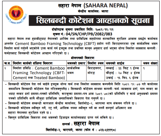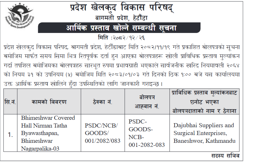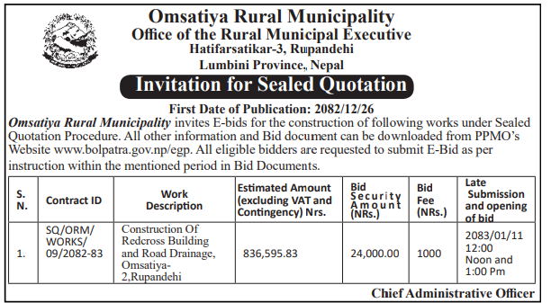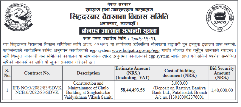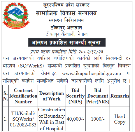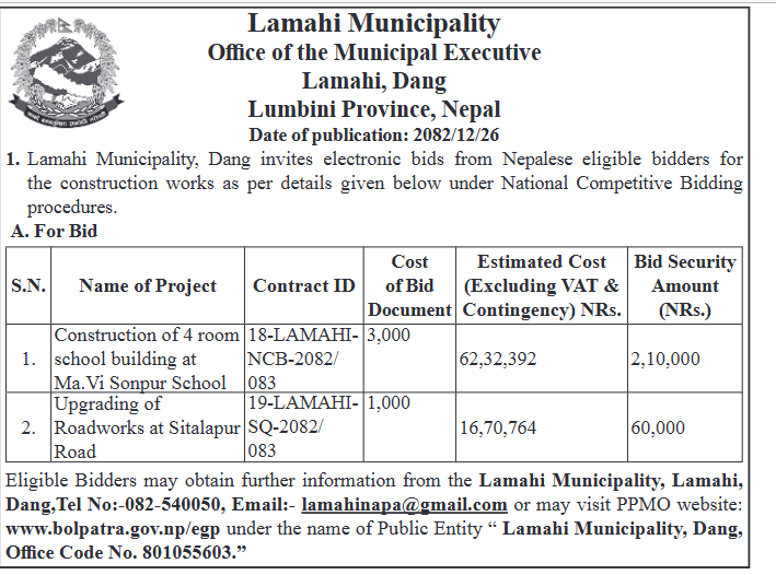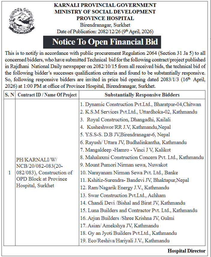 | 164 | Health office,Siraha | MP/HOS/NCB/ GOODS-1/2082-083 ( Cement, Flat Brick, Construction Materials, Slab, Bands) | 08/04/2026 | PPMO | 08/05/2026 | Click Here | |