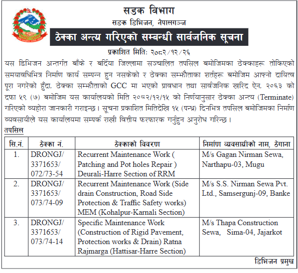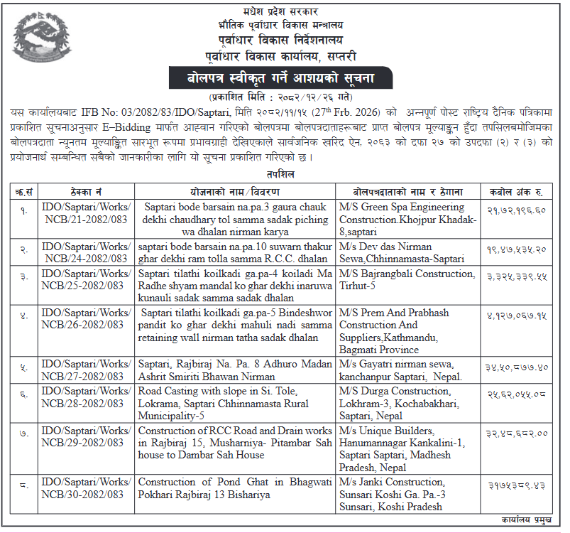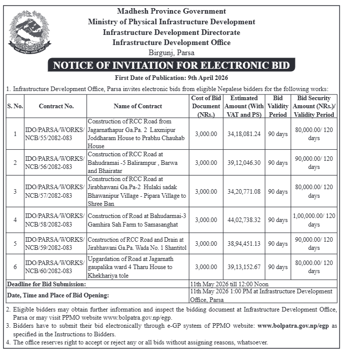 निर्माण सम्बन्धी प्रकाशित सम्पूर्ण ठेक्का टेन्डर तथा बोलपत्र सुचनाहरु प्रदेश अनुसार 09/04/2026 (Thursday)