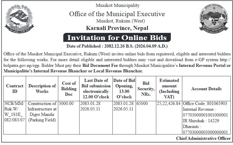 | 27 | Malika Rural Municipality,Myagdi | Procurement of Diesel and Petrol mini tillers for farmers in Malika Rural Municipality. | 08/04/2026 | PPMO | 23/04/2026 | Click Here | |