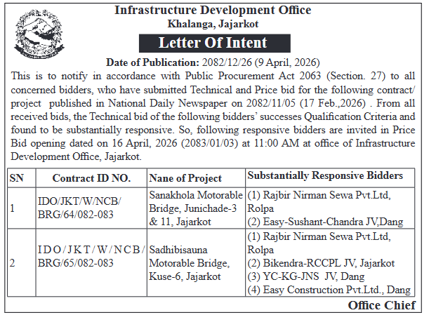 | 49 | Infrastructure Development Office, Humla | Construction Of Khapar Khola Ghatte Khola Culvert,Humla | 08/04/2026 | PPMO | 08/05/2026 | Click Here | |