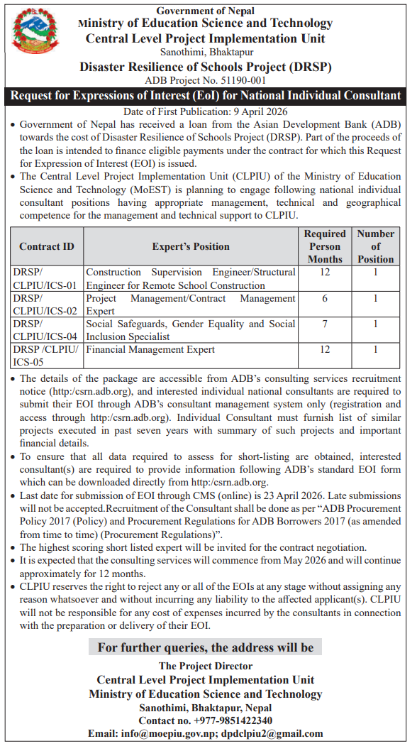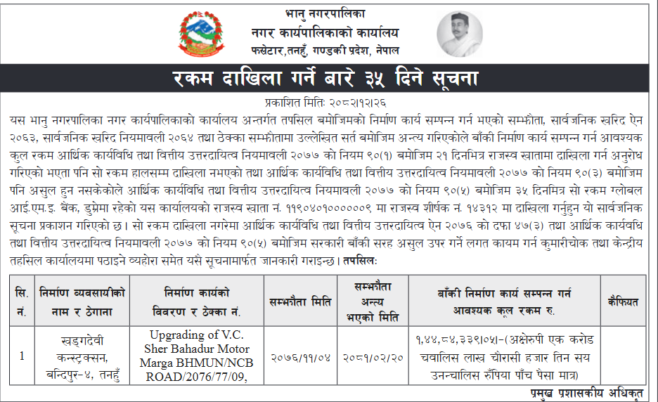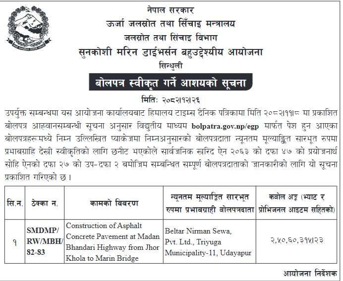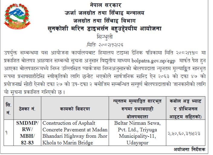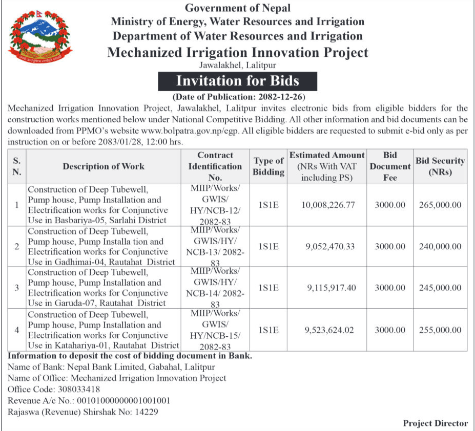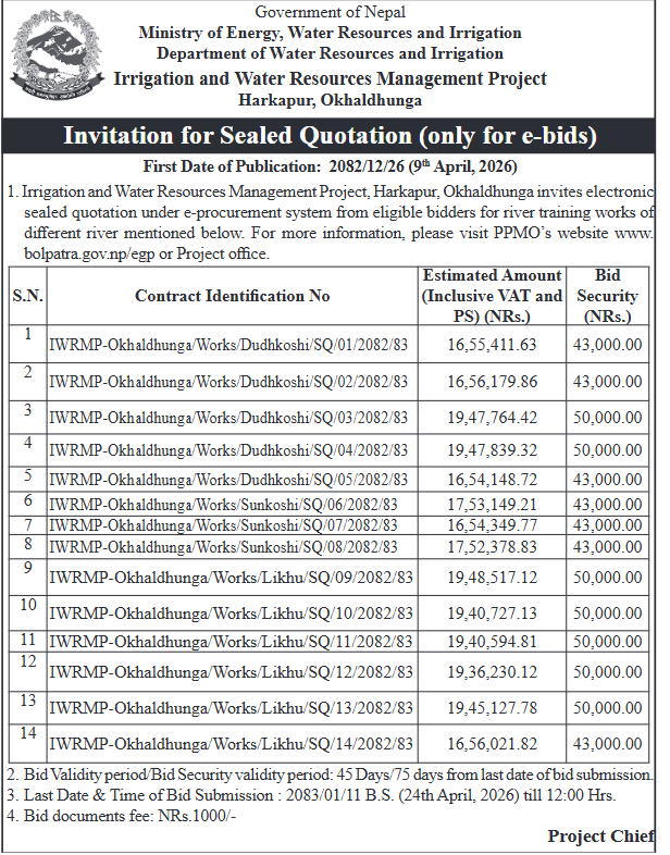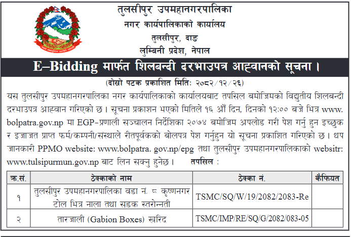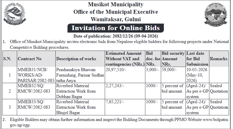 | 191 | Bharatpur Metropolitian City Office, Bagmati Province, CHITWAN; | Income Collection from Riverbed Materials at Thimura, BMC-1(Trishuli River) | 08/04/2026 | PPMO | 08/05/2026 | Click Here | |