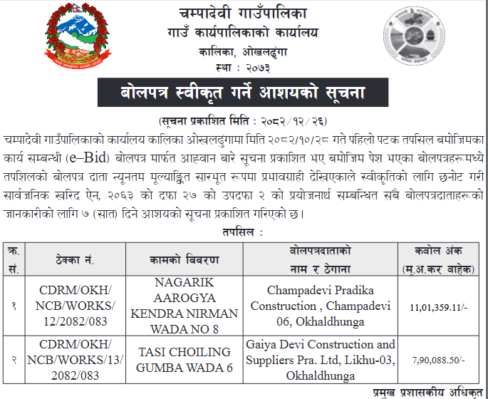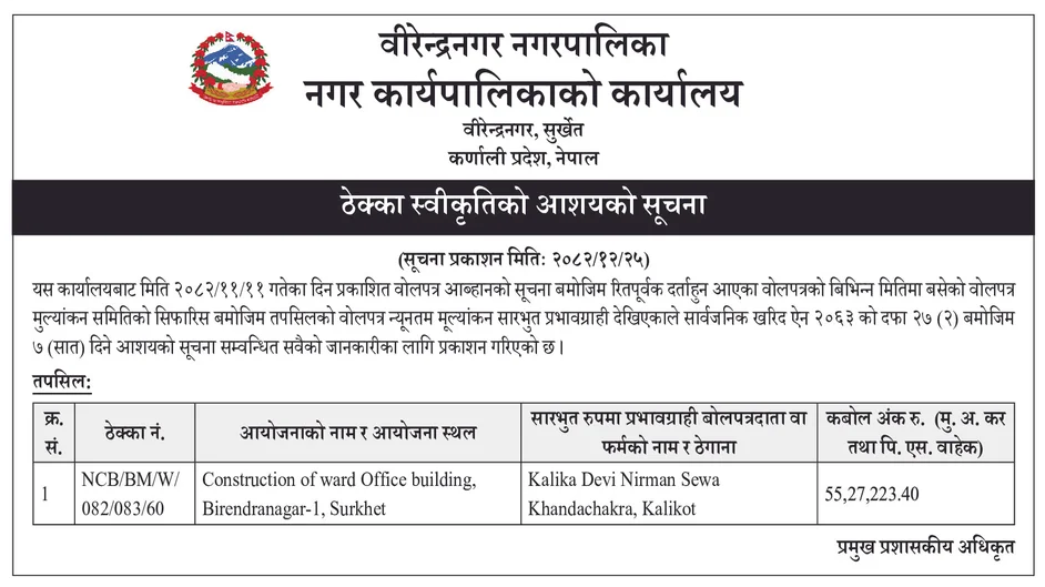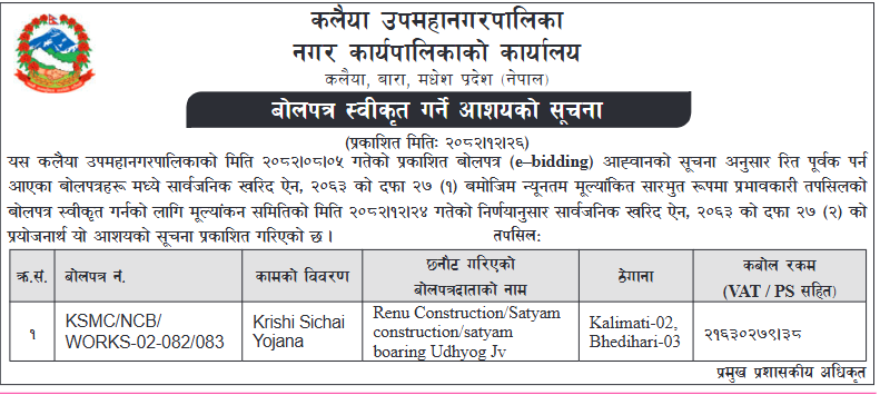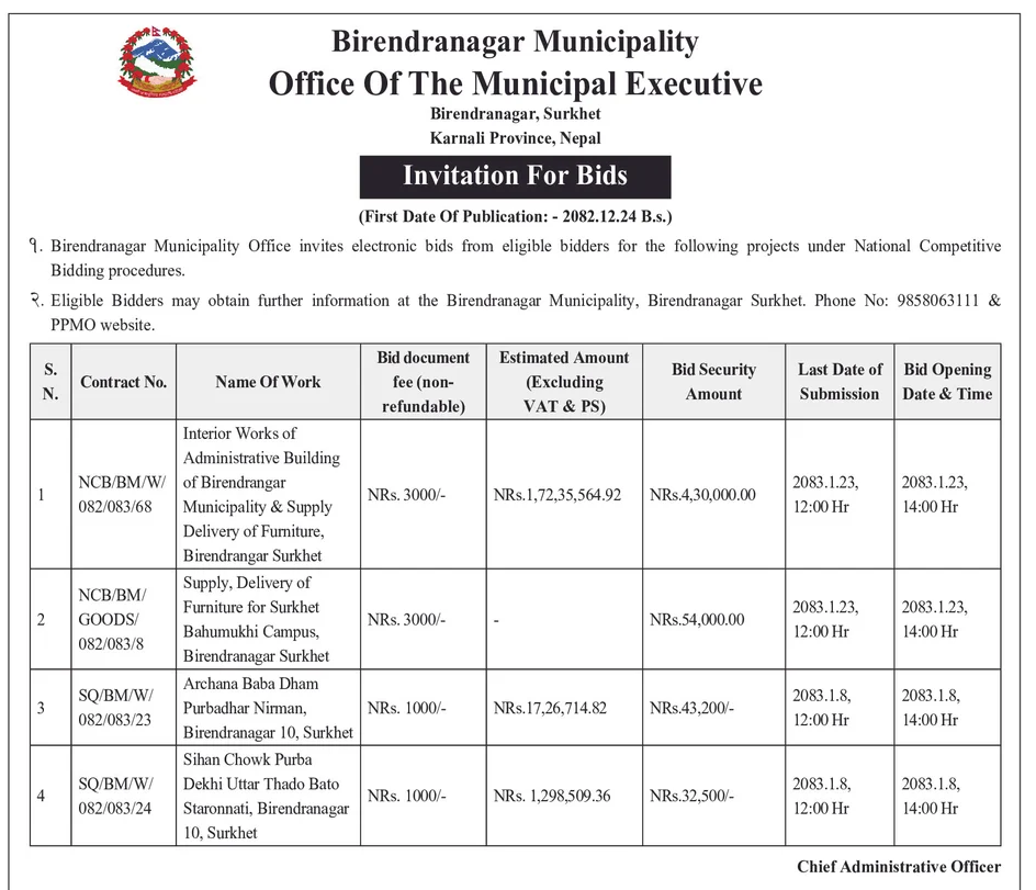 | 212 | Lekbeshi Municipality Office, Surkhet | Nera Ma bi Chuniyapani Bhawan Nirman | 08/04/2026 | PPMO | 08/05/2026 | Click Here | |