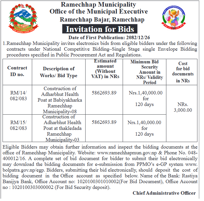 | 18 | Bhimphedi Rural Municipality | Procurement, Supply and delivery of Medicines and Surgical Supplies | 08/04/2026 | PPMO | 23/04/2026 | Click Here | |