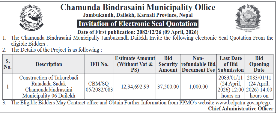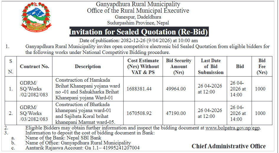 | 148 | Sarada Municipality, Khalanga, Salyan | Procurement for Goods of Sharada Municipality Integrated Digital Services and Information Management System ( Computer, Display Board, Server, Router, Battery, Printer, Scanner, TV, Speaker, Inverter) | 08/04/2026 | PPMO | 10/05/2026 | Click Here | |