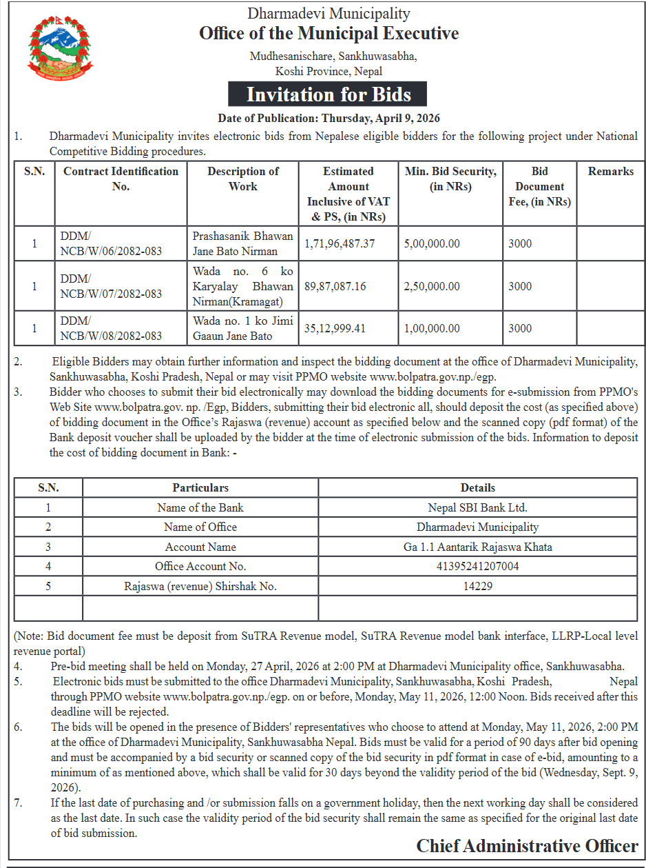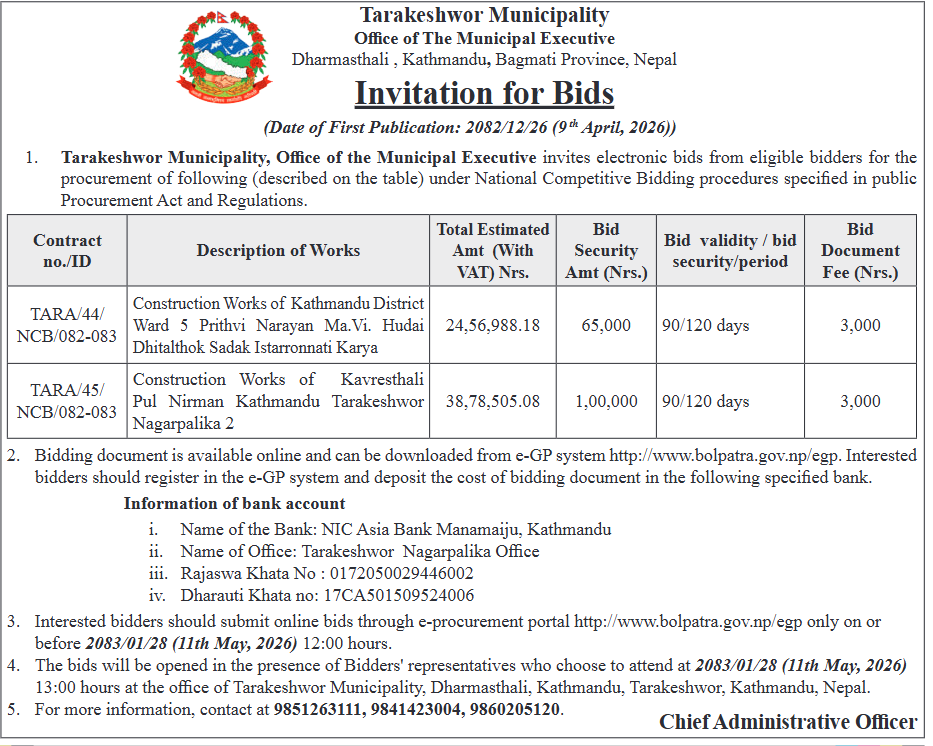 | 135 | Sahari Bikash Tatha bhawan Karyalaya Kavre | Raktasanchar Sewa Bhawan Nirman Kavre | 08/04/2026 | PPMO | 23/04/2026 | Click Here | |