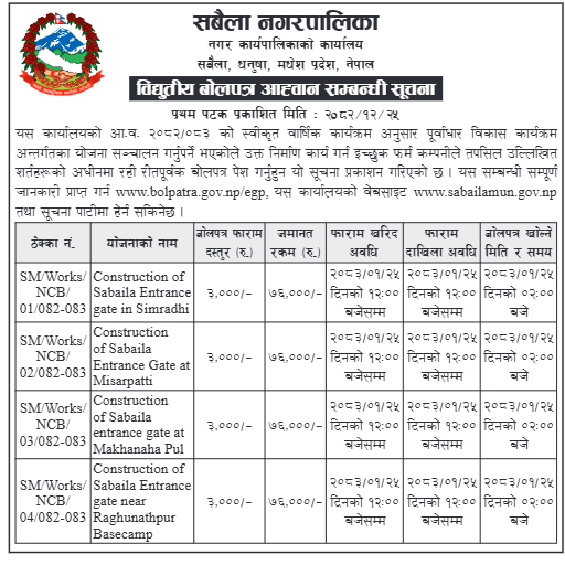 | 219 | Mithila Municipality | Construction of mithila sagar pokhariya saundaryakaran mi na pa -07 and pokhariyama rheko mandir starunnati vada no -07 | 08/04/2026 | PPMO | 08/05/2026 | Click Here | |