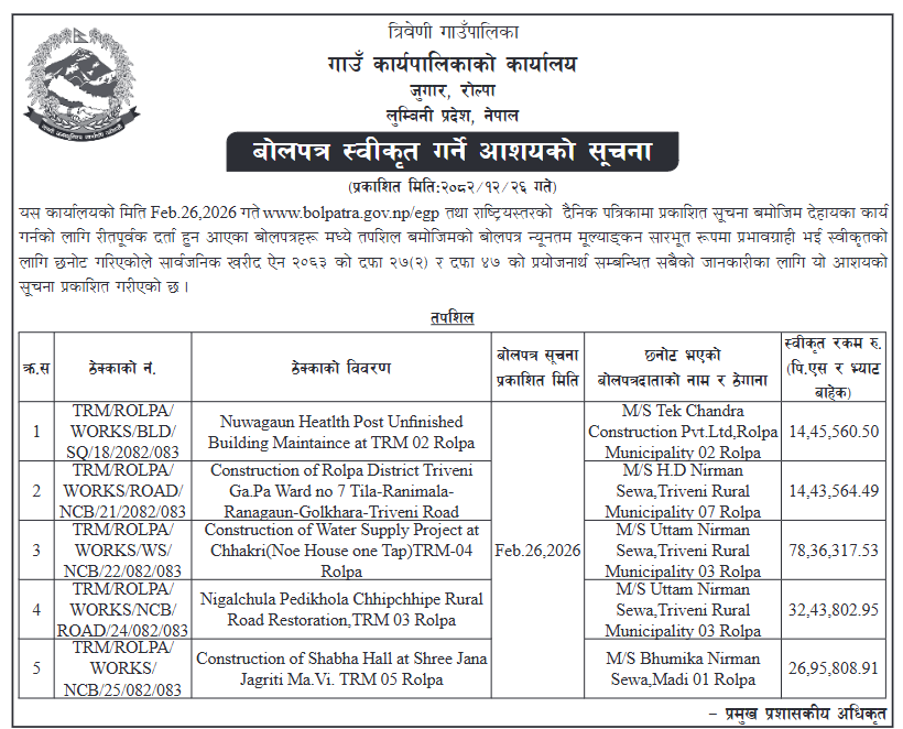 | 220 | Rolpa Municipality Office, Lumbini Province, ROLPA; | Libang bazar area sadak marmat yojana.. | 08/04/2026 | PPMO | 08/05/2026 | Click Here | |