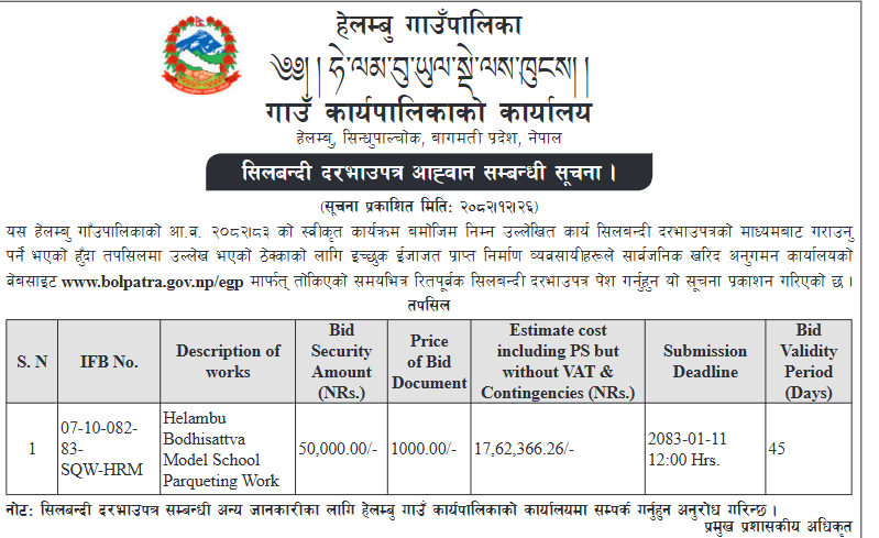 | 183 | Helambu Rural Municipality | Construction of Sarbodaya Mavi Hostel, Ward-05 | 08/04/2026 | PPMO | 08/05/2026 | Click Here | |