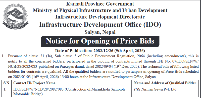 | 155 | Infrastructure Development Office , Rukum | Supply work of steel parts of suspended bridge at different location of Rukum West District | 08/04/2026 | PPMO | 08/05/2026 | Click Here | |