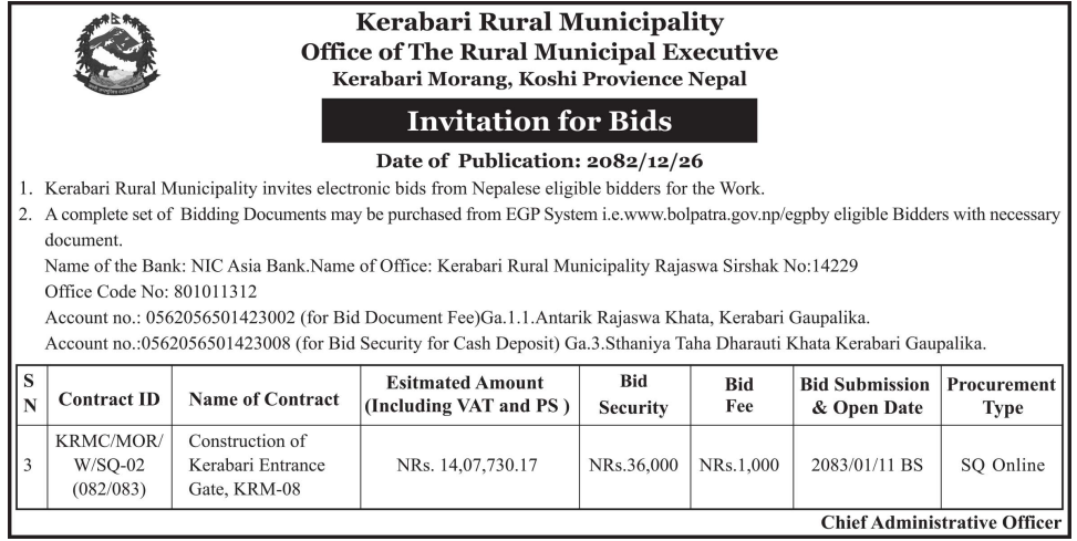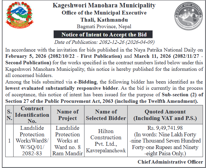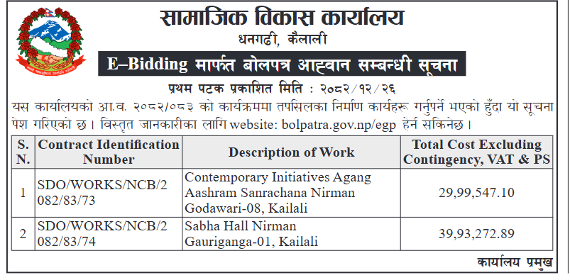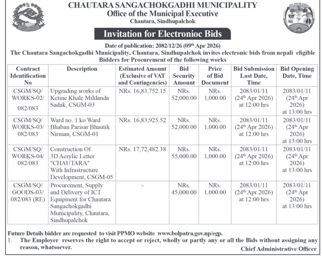 | 133 | Sahari Bikash Tatha bhawan Karyalaya Kavre | Sindhupalchok Jilla Patle Latu Sadak Estaronnati, Tripurasundari, Sindhupalchok | 08/04/2026 | PPMO | 23/04/2026 | Click Here | |