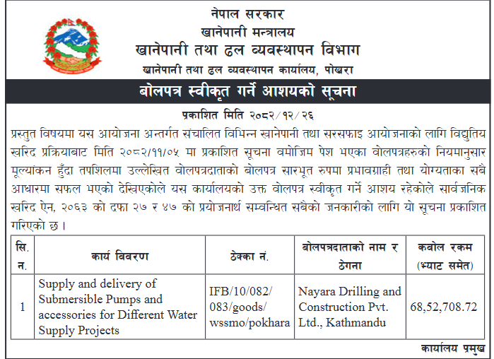 | 188 | Pokhara Metropolitan City Office | Construction of Infrastructures in Bharatpokhari Kristi Nirmalpokhari Khanepani Yojana and Supply of Pumping Motor, PMC- 21 (Contract ID: 118/PMC/NCB/W/Purbadhar/082-83) | 08/04/2026 | PPMO | 08/05/2026 | Click Here | |