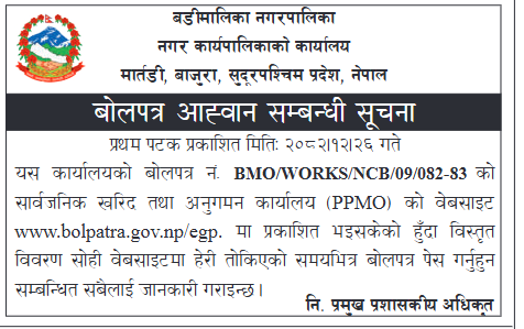 | 193 | Baglung Municipality | Maintenance works of Tirupati chowk to Panchakot Road | 08/04/2026 | PPMO | 08/05/2026 | Click Here | |