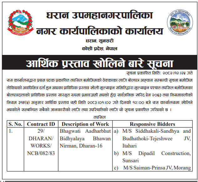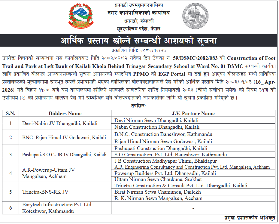 | 8 | Dhangadhi Sub-Metropolitan City | Lease Contract for Dhangadhi Sabha Griha at Ward No. 8 Dhangadhi Sub Metropolitan City | 08/04/2026 | PPMO | 29/04/2026 | Click Here | |