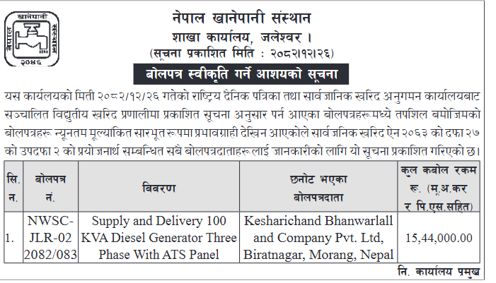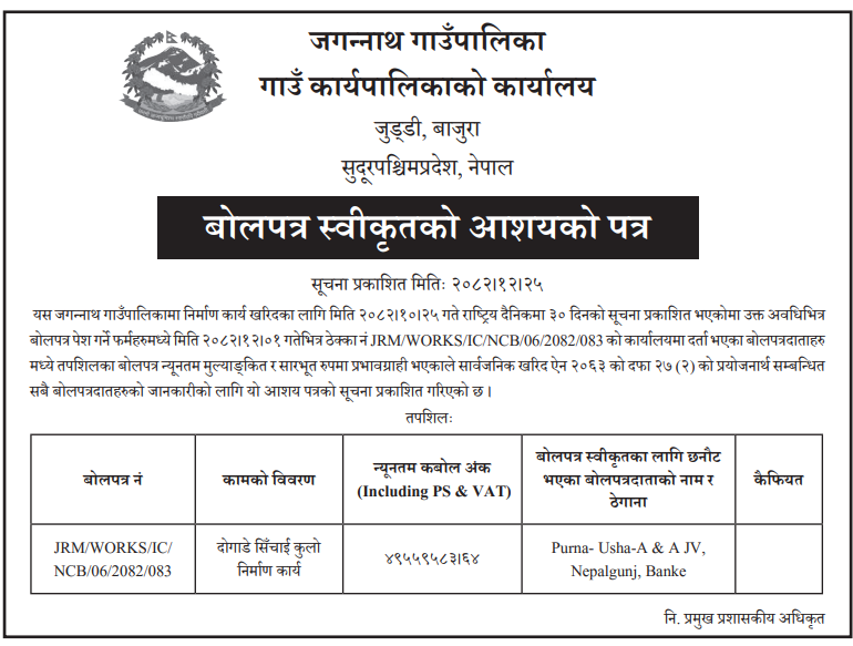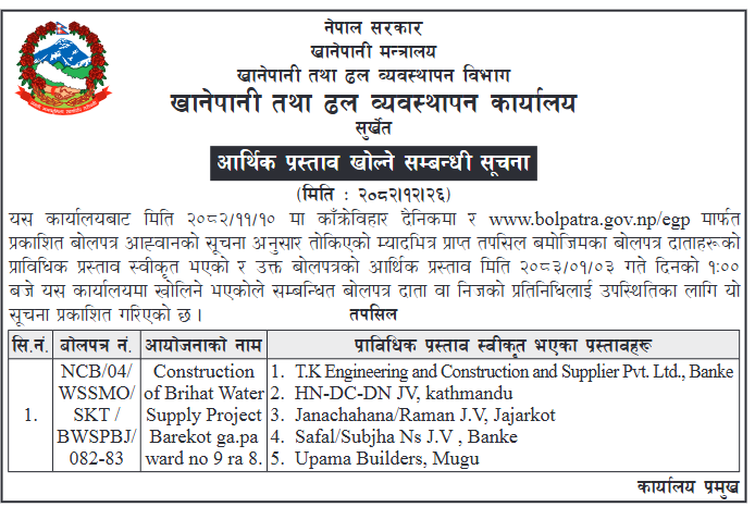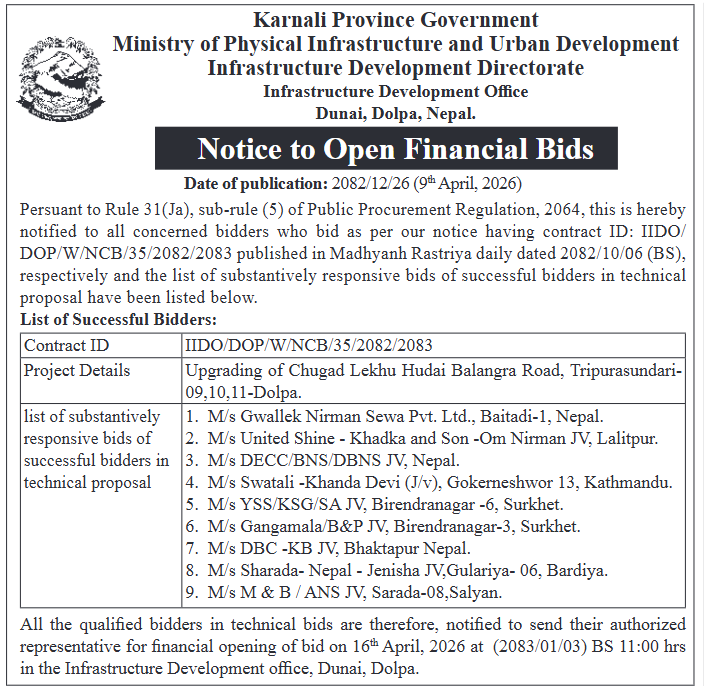 | 196 | Water Supply, Irrigation & Energy Development Office, Dunai | Narku Dekhi Tallo Narku Samma Khaanepani Aayojana, Mudkechula 6, Dolpa | 08/04/2026 | PPMO | 08/05/2026 | Click Here | |