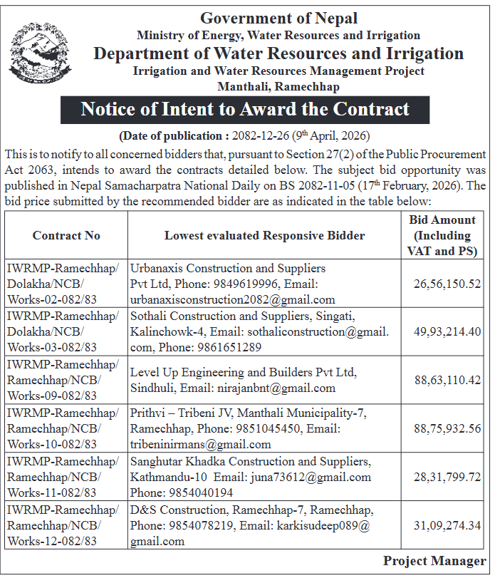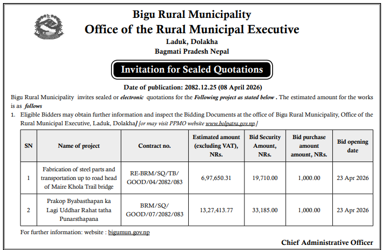 | 17 | Bigu Rural Municipality, Dolkha | Prakop Byabasthapan ka Lagi Uddhar Rahat tatha Punarsthapana | 08/04/2026 | PPMO | 23/04/2026 | Click Here | |