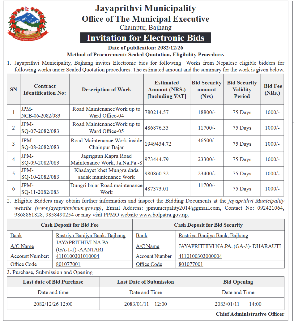 | 40 | Bheemdatt Municipality | Road upgrading and Maintenance of various roads of Bheemdatt Municipality ( Ward no. Ward No.1,2,4,5,10,13,16,18) | 08/04/2026 | PPMO | 08/05/2026 | Click Here | |