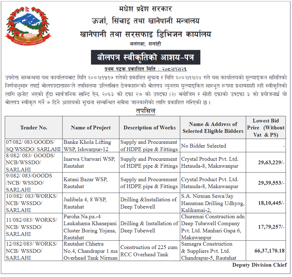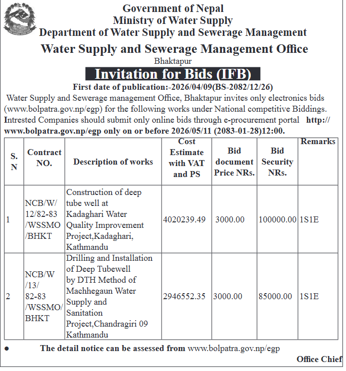 | 7 | Water Supply & Sanitation Division Office, Dadeldhura | Supply and Delivery of HDPE Pipe (PE-100) - (Confirming to NS 40:2079) for Various Water Supply Projects of Dadeldhura and Bajhang District. | 08/04/2026 | PPMO | 08/05/2026 | Click Here | |