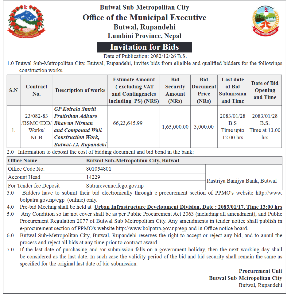 | 184 | Butwal Sub-Metropolitan City | Janashakti Namuna Bhim Prashaad Gomata Neupane Pra.Vi ma Bibhinna Nirman Karya, Butwal-17, Rupandehi | 08/04/2026 | PPMO | 08/05/2026 | Click Here | |