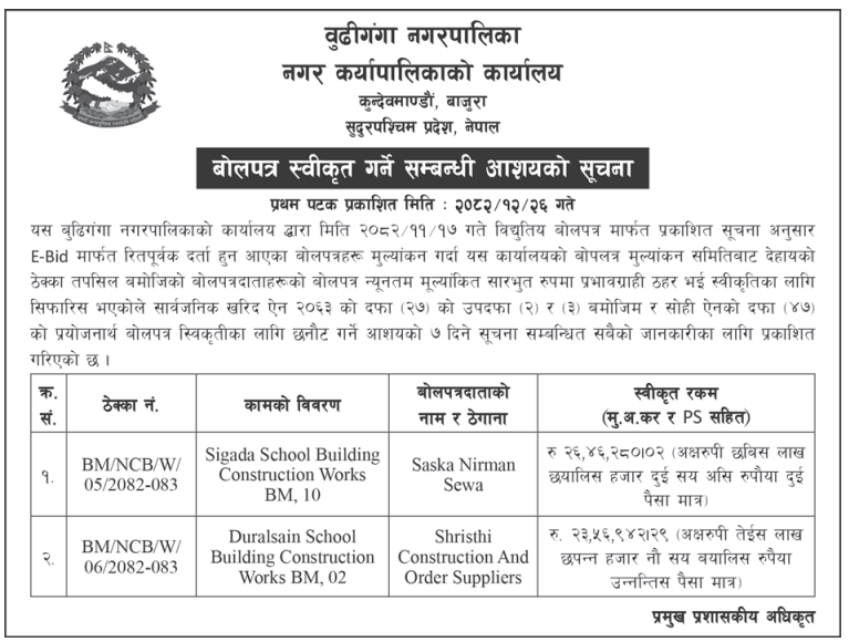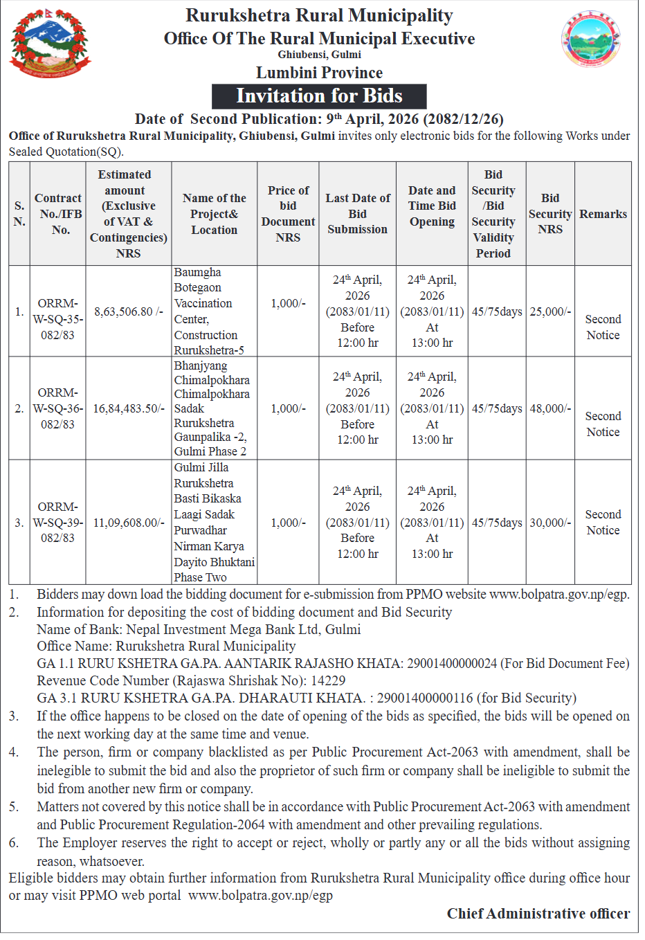 | 15 | Bannigadhi Jayagadha Rural Municipality | procurement of Medicine And Surgical items | 08/04/2026 | PPMO | 23/04/2026 | Click Here | |