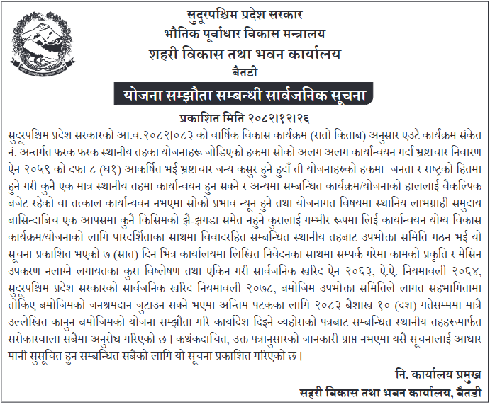 | 171 | Office of Dipayal Silgadhi Municipal Executive | Administrative building furniture furnishing | 08/04/2026 | PPMO | 08/05/2026 | Click Here | |