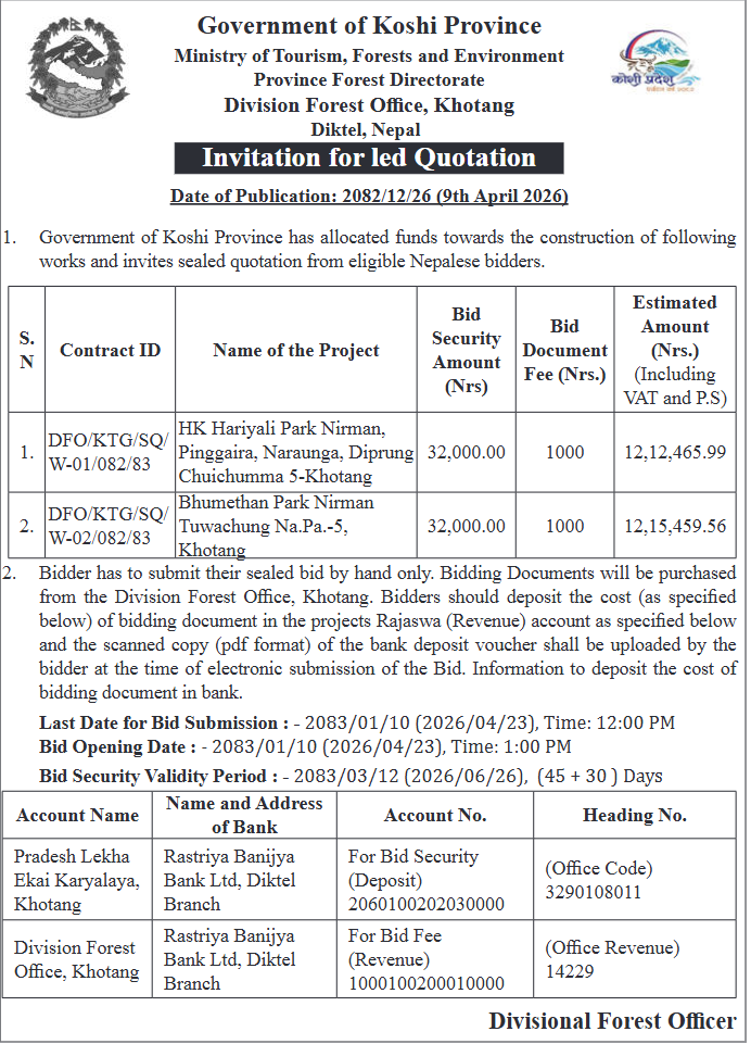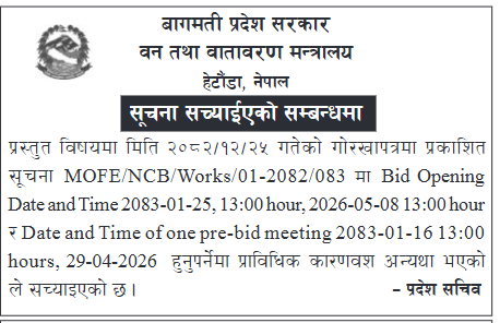 | 199 | Ministry of Forests and Environment, Bagamati Province | Construction of Incomplete Division Building of Ministry of Forests and Environment (MOFE), Bagamati, Hetauda, Nepal | 08/04/2026 | PPMO | 08/05/2026 | Click Here | |