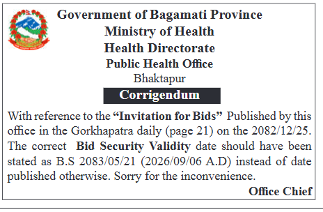 | 2 | Public Health Office, Bhaktapur | Supply And Installation of Outdoor Fitness Equipments (Byayamshala For Health Promotion) | 08/04/2026 | PPMO | 08/05/2026 | Click Here | |