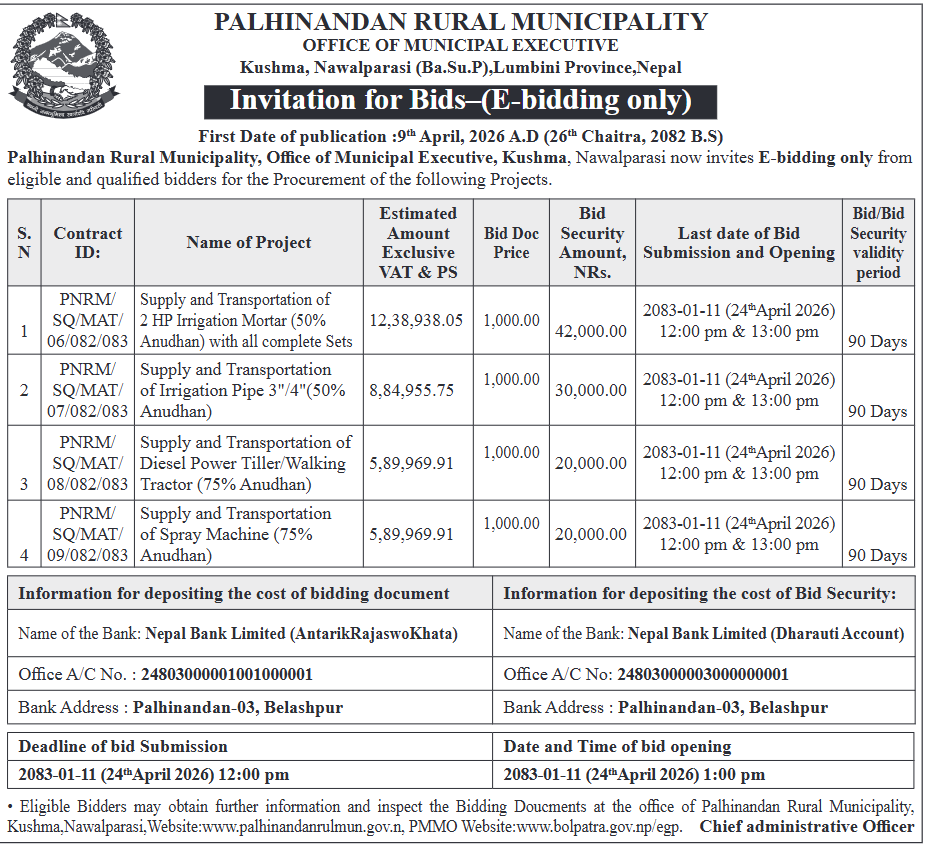 | 36 | Pakhribas Municipality | Procurement of Mini Tiller for Ward office (85% Anudan) | 08/04/2026 | PPMO | 23/04/2026 | Click Here | |