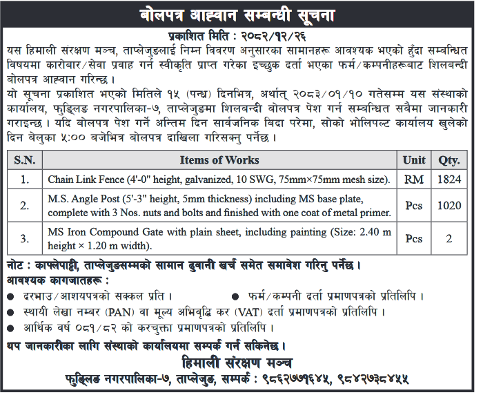 | 217 | Mithila Municipality | construction of janata ma bidhyalaya ghera bera nirman | 08/04/2026 | PPMO | 08/05/2026 | Click Here | |