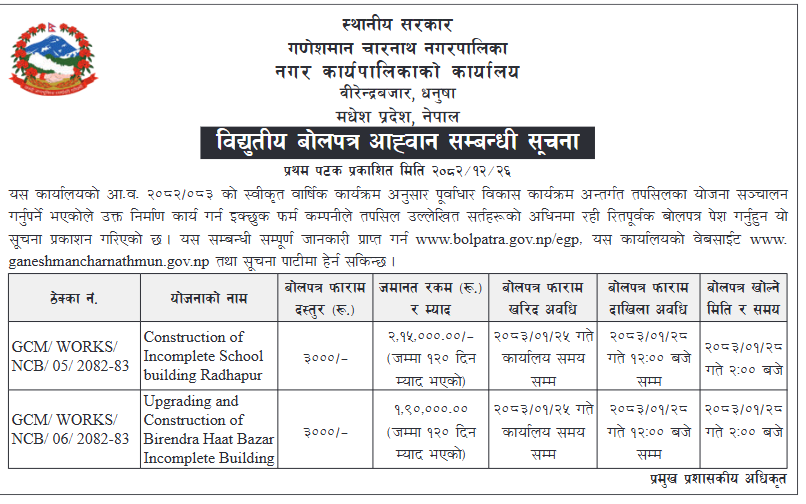 | 206 | Manarasishwa Municipality | Construction of Dharmshala Building Behind Shree Ja.Ma.Vi. School, Sahni Tole,ward-05 | 08/04/2026 | PPMO | 08/05/2026 | Click Here | |