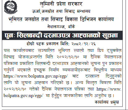 | 182 | Water Supply and Sewerage Management Office, Nepalgunj | Installation of Presssure Filter at Sanoshree WQIP Bardiya, Samshergunj WQIP Banke and Birat WQIP Banke | 08/04/2026 | PPMO | 08/05/2026 | Click Here | |