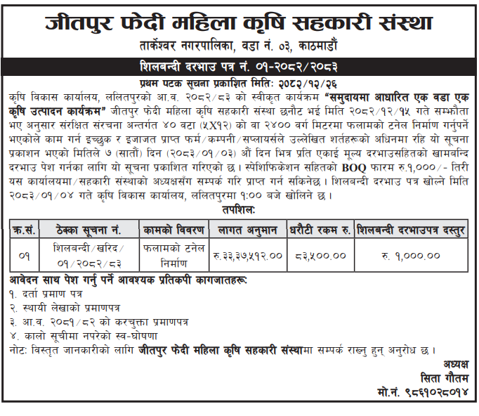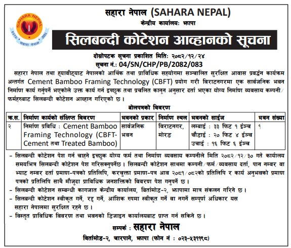| 136 | Sahari Bikash Tatha bhawan Karyalaya Kavre | Sevenstar Shanti Park Chautara Na Pa-12 Phalate, Sanghachokgadi , Sindhupalchok | 08/04/2026 | PPMO | 23/04/2026 | Click Here | |