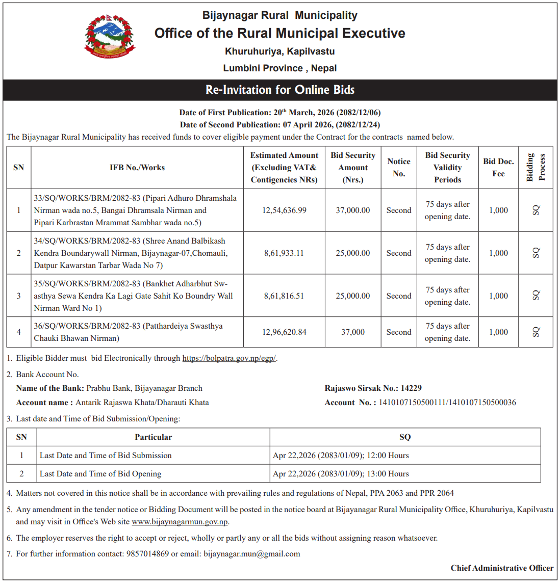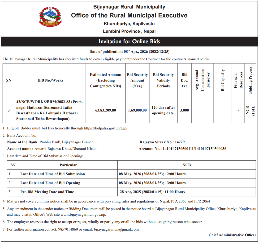 | 37 | Bijaynagar Rural Municipality | Premnagar Hatbazar Staronnati Tatha Bewasthapan Ra Lohraula Hatbazar Staronnati Tatha Bewasthapan | 08/04/2026 | PPMO | 08/05/2026 | Click Here | |