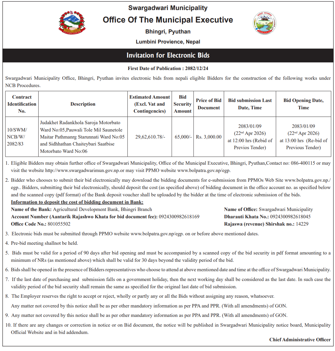 | 22 | Lekbeshi Municipality Office, Surkhet | construction and upgrading of different road work in ward no 4 | 08/04/2026 | PPMO | 22/04/2026 | Click Here | |