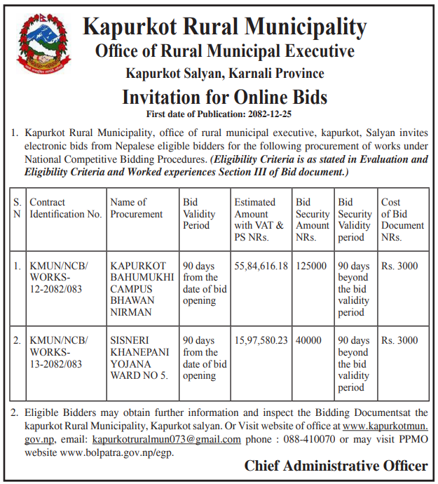 | 197 | Office of Rural Municipality Kapurkot ,salyan | Kapurkot Bahumukhi Campus Bhawan Nirman | 08/04/2026 | PPMO | 08/05/2026 | Click Here | |