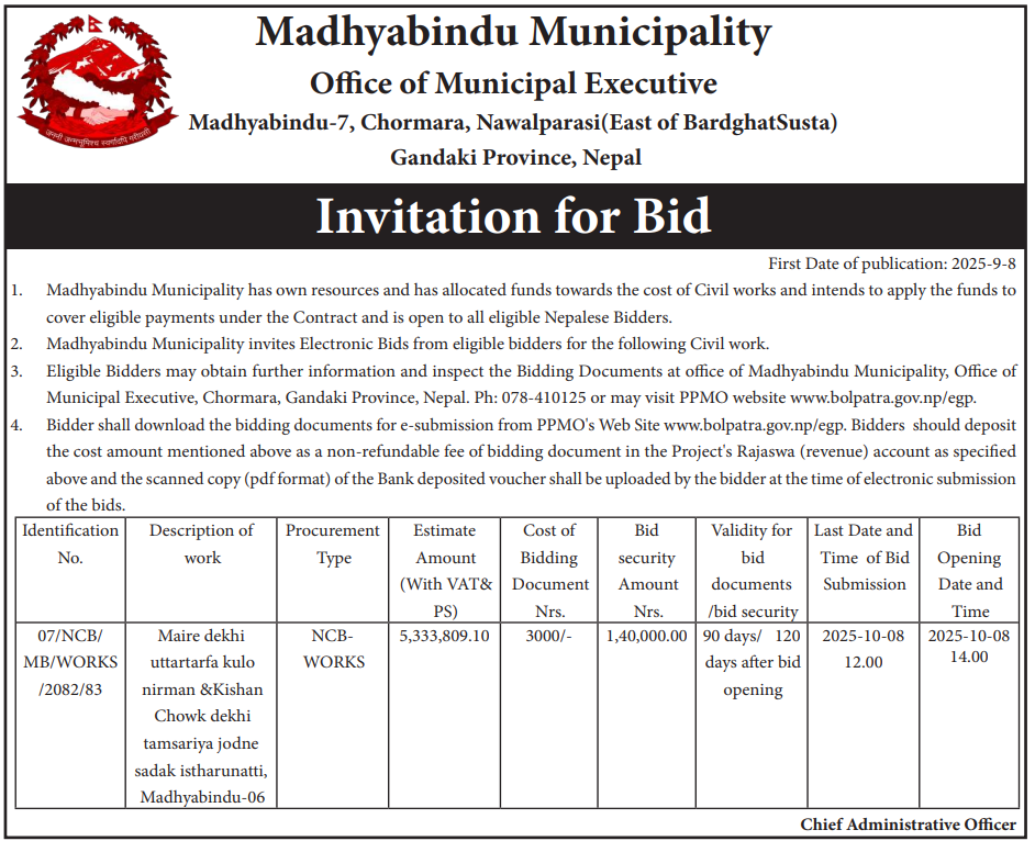 | 32 | Madhyabindu Municipality | Maire dekhi uttar tarfa kulo nirman & Kishan Chowk dekhi tamsariya jodne sadak istharunatti, Madhyabindu-06 | 08/09/2025 | PPMO | 08/10/2025 | Click Here | |