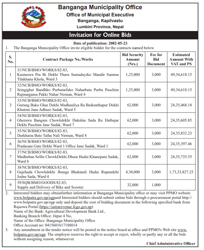 | 15 | Banganga Municipality Office | Gajehada Chowkdekhi Jhunga Bhaktauli Hudai Rupandehi Jodne Sada, Ward 4 | 08/09/2025 | PPMO | 09/10/2025 | Click Here | |