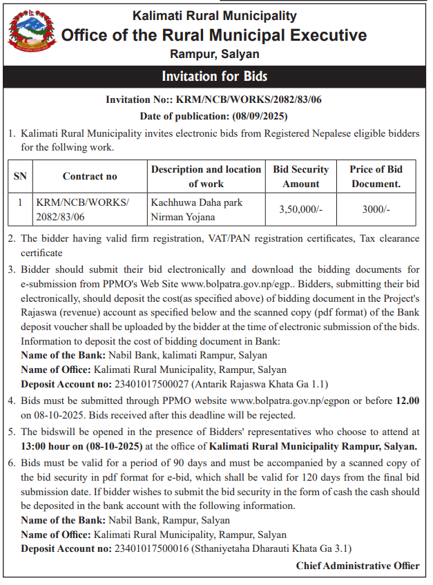 | 89 | kaligandaki rural municipality | Kachhuwa Daha Park Nirman Yojana. | 08/09/2025 | PPMO | 08/10/2025 | Click Here | |