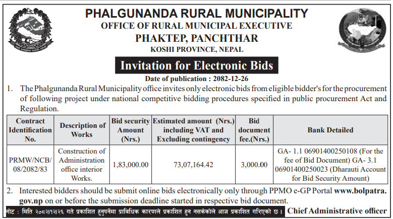 | 32 | Phalgunanda Rural Municipality | Construction of Administration office interior Works phalgunanda-05 | 09/04/2026 | PPMO | 11/05/2026 | Click Here | |