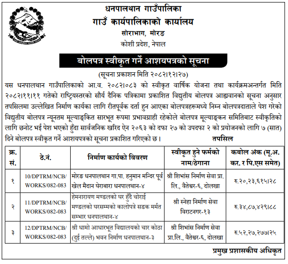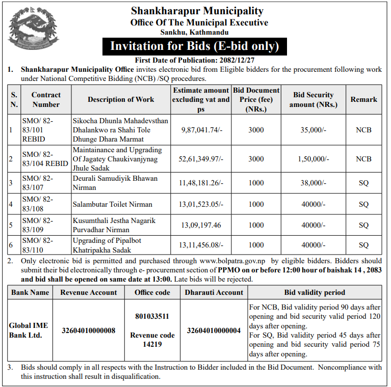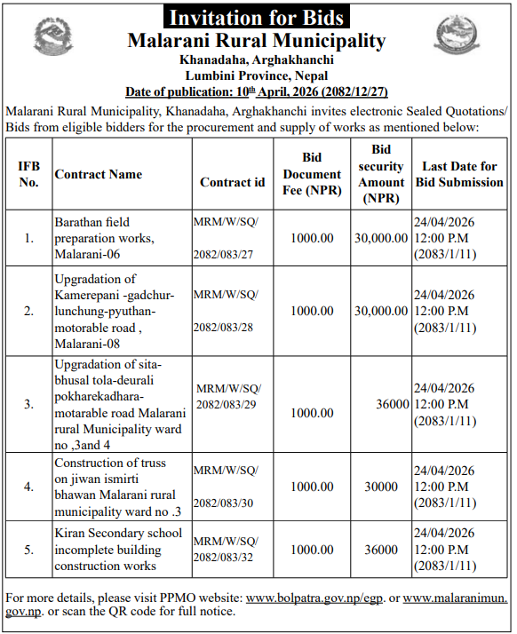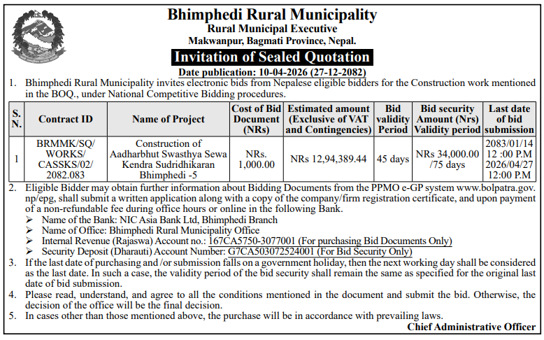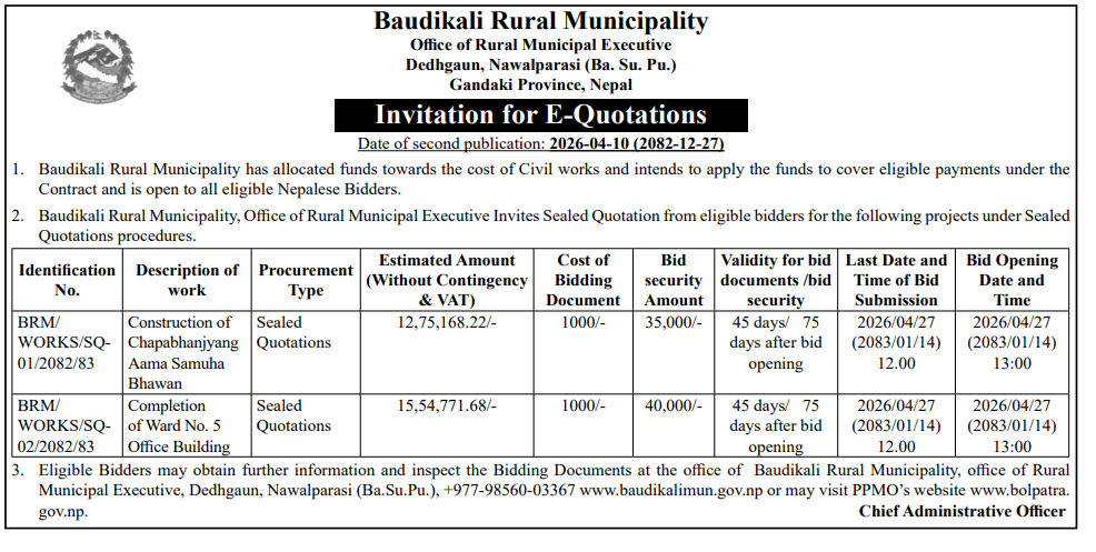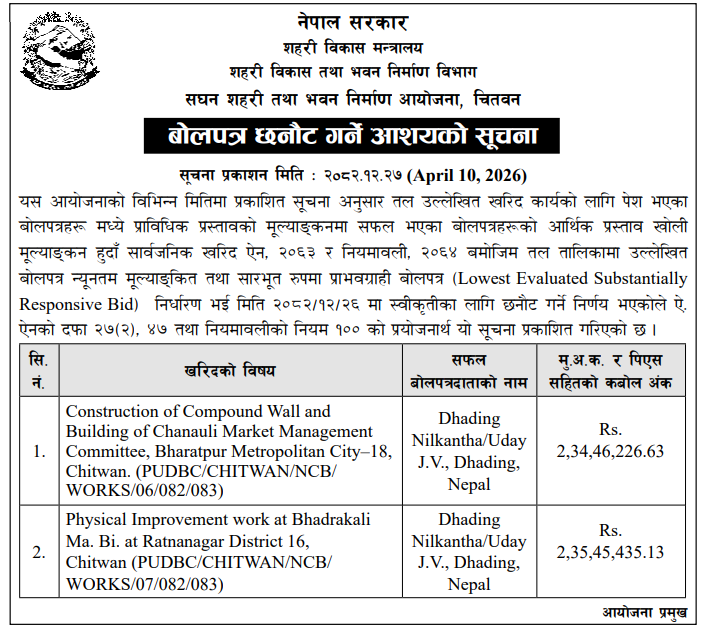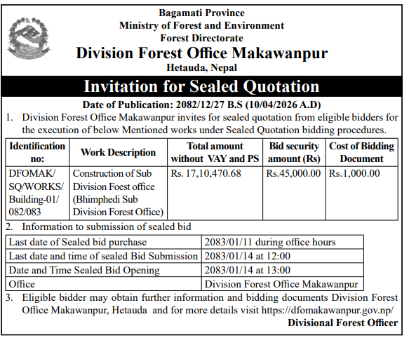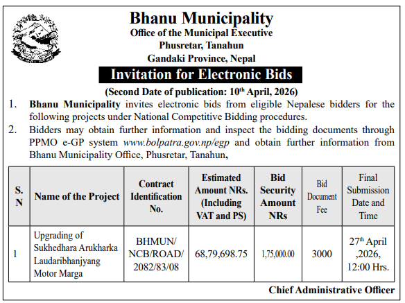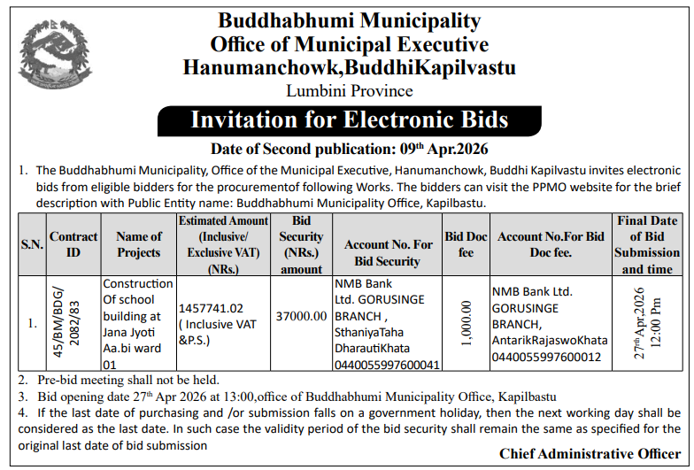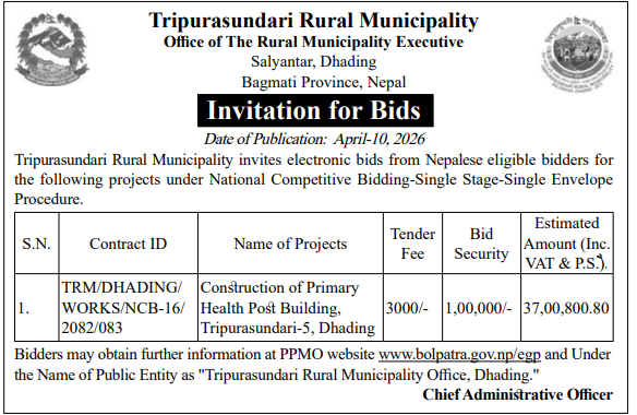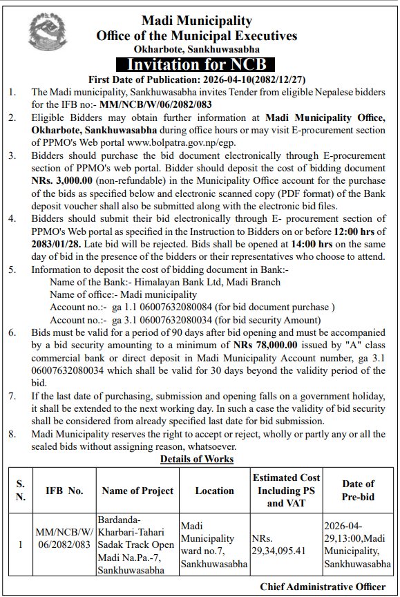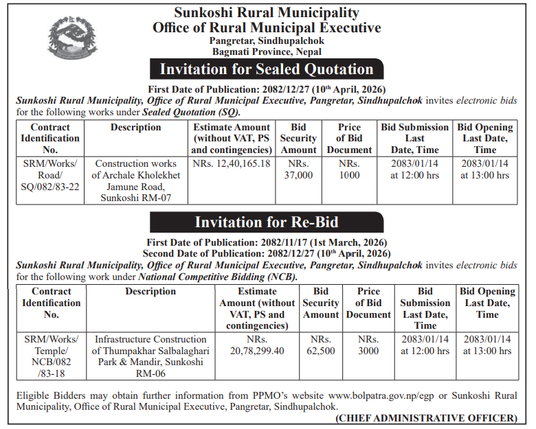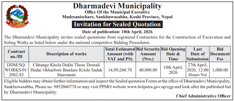 | 4 | Dharmadevi Municipality Office, Koshi Province, SANKHUWASABHA; | Prashasanik Bhawan Jane Bato Nirman Yojana | 09/04/2026 | PPMO | 11/05/2026 | Click Here | |