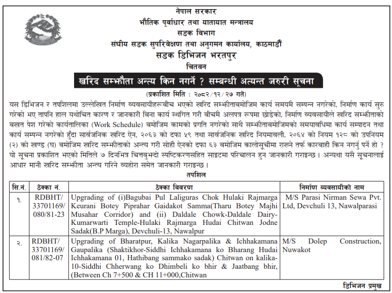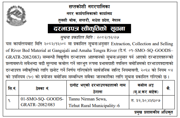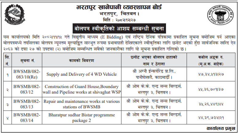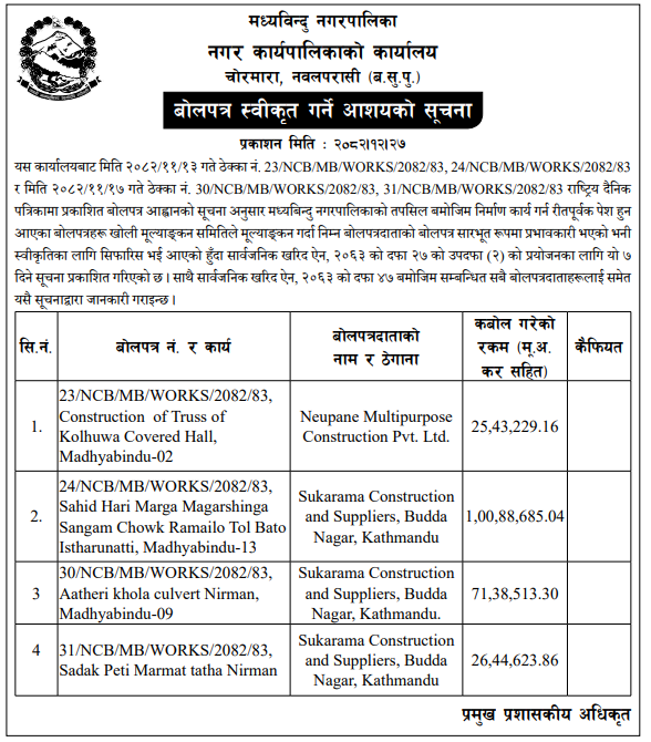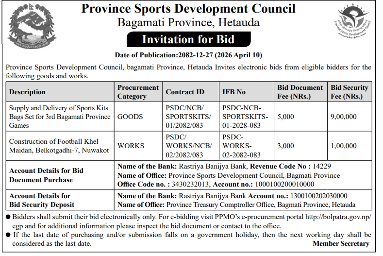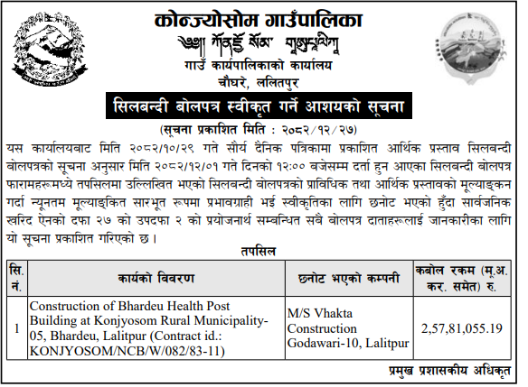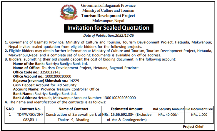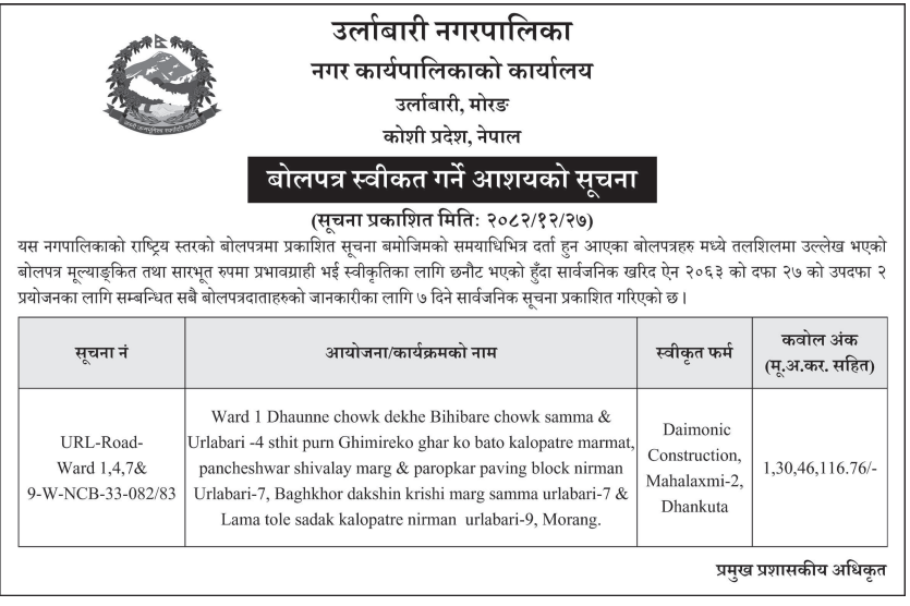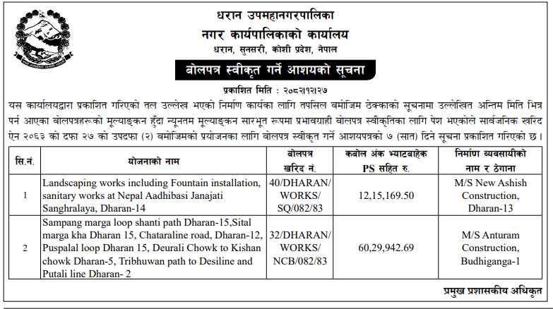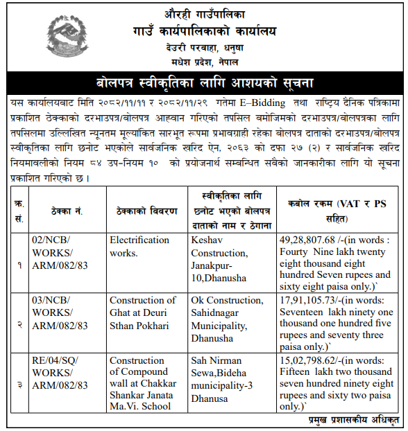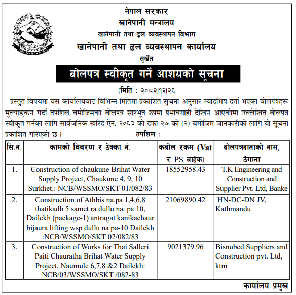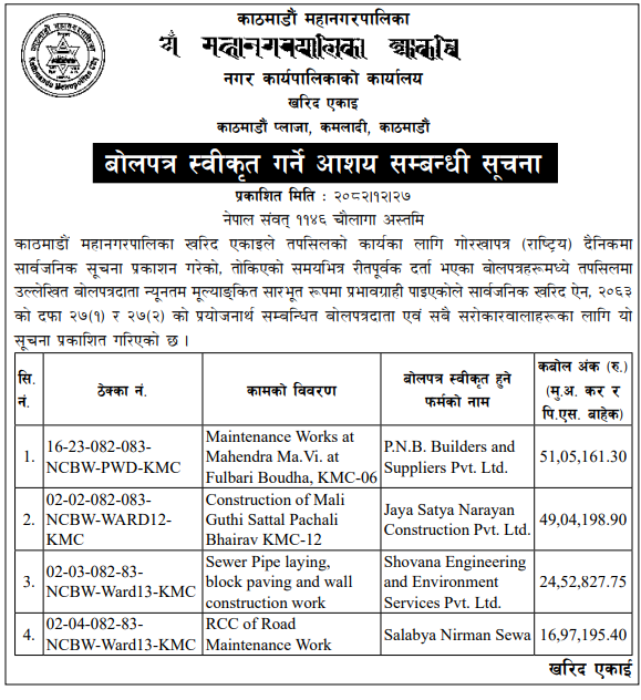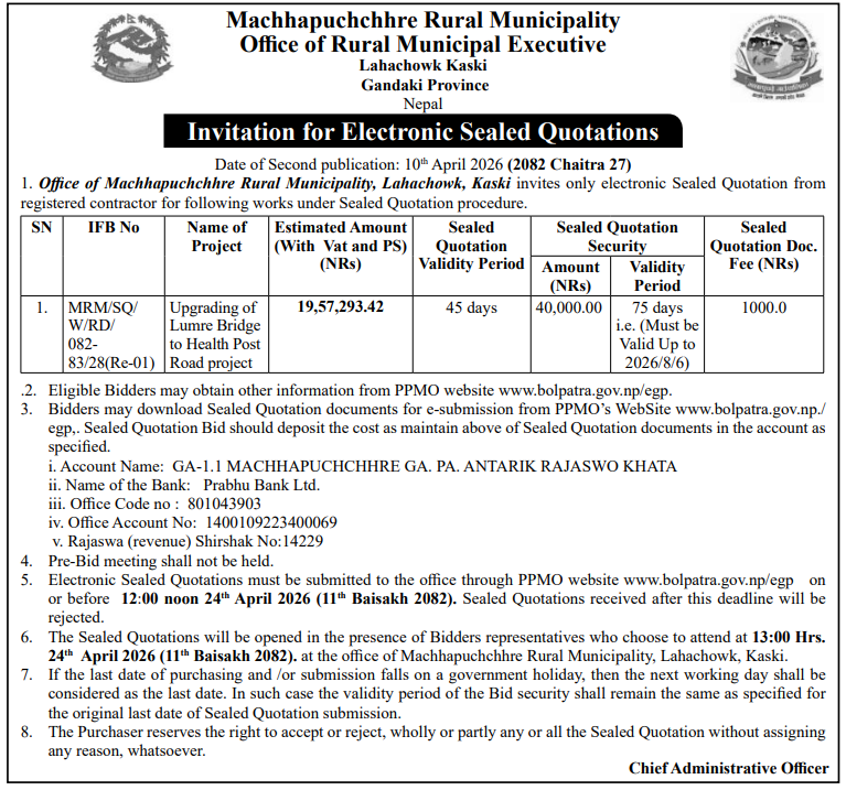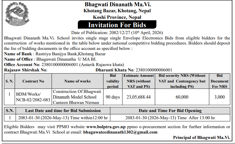 | 4 | Dharmadevi Municipality Office, Koshi Province, SANKHUWASABHA; | Prashasanik Bhawan Jane Bato Nirman Yojana | 09/04/2026 | PPMO | 11/05/2026 | Click Here | |