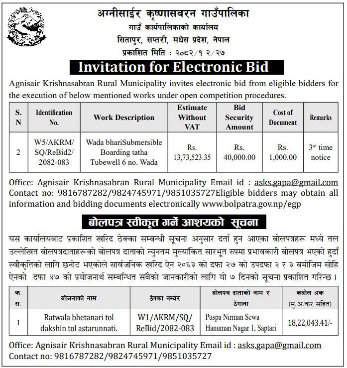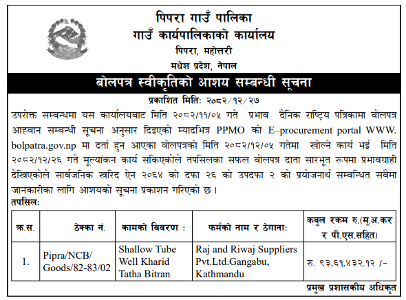 | 21 | Mechanized Irrigation Innovation Project | Construction of Deep Tubewell, Pump house, Pump Installation and Electrification works for Conjunctive Use in Garuda-07, Rautahat District | 09/04/2026 | PPMO | 11/05/2026 | Click Here | |