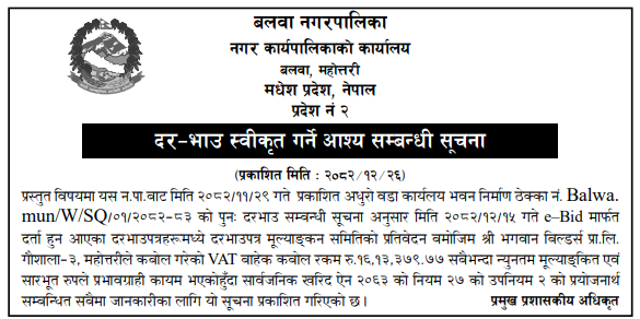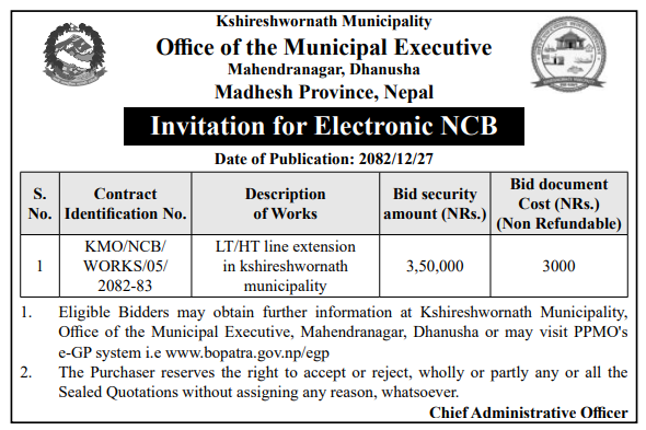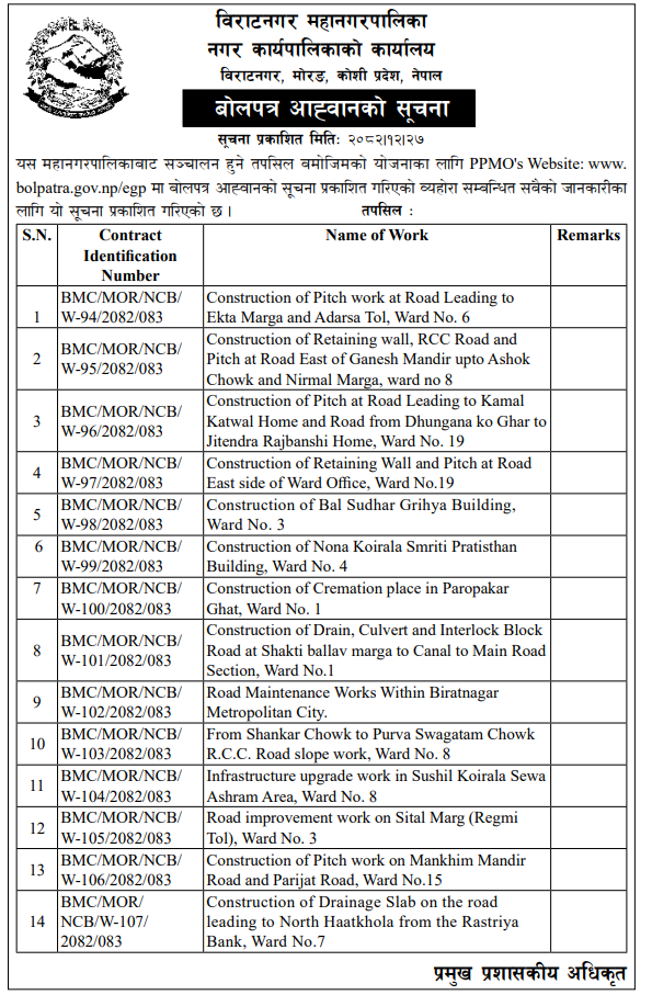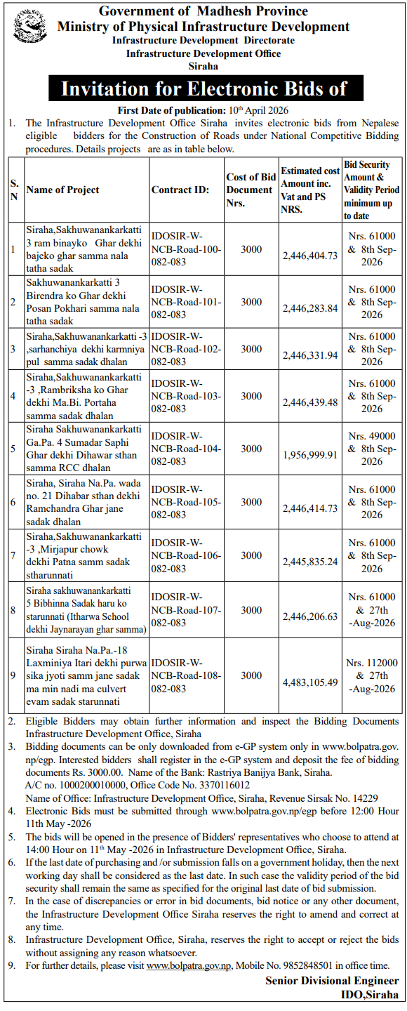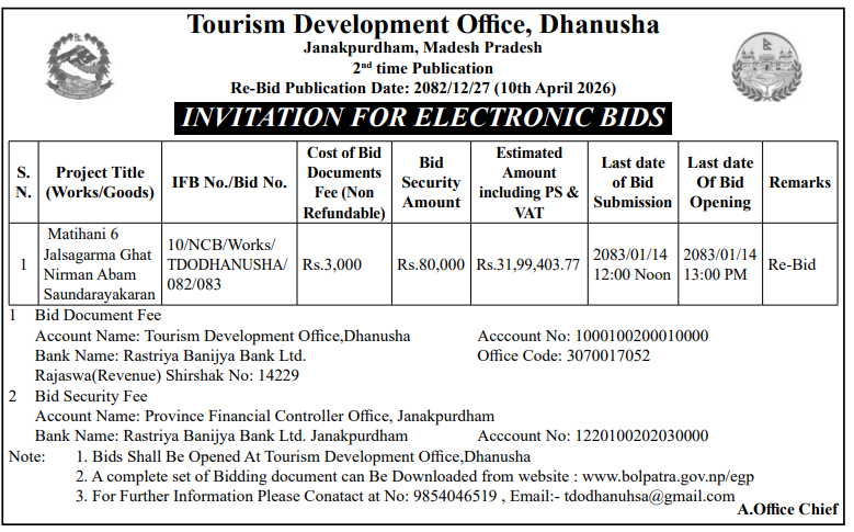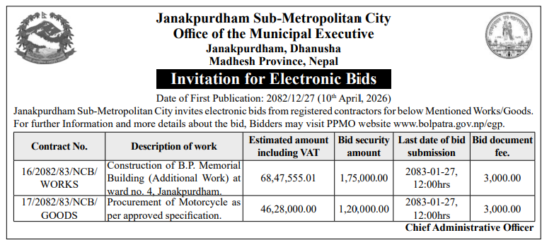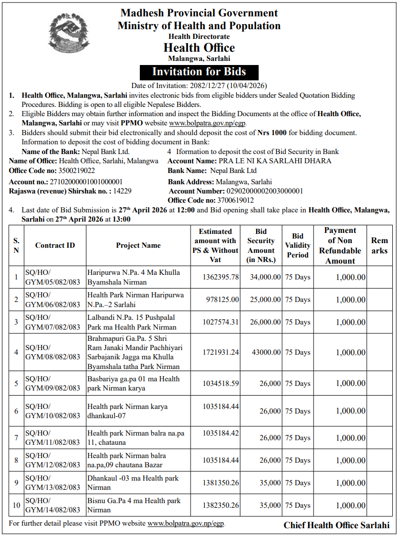 | 8 | Ganeshman Charnath Municipality Office, Madhesh Province, DHANUSA; | Upgrading and Construction of Birendra Haat Bazar Incomplete Building | 09/04/2026 | PPMO | 11/05/2026 | Click Here | |